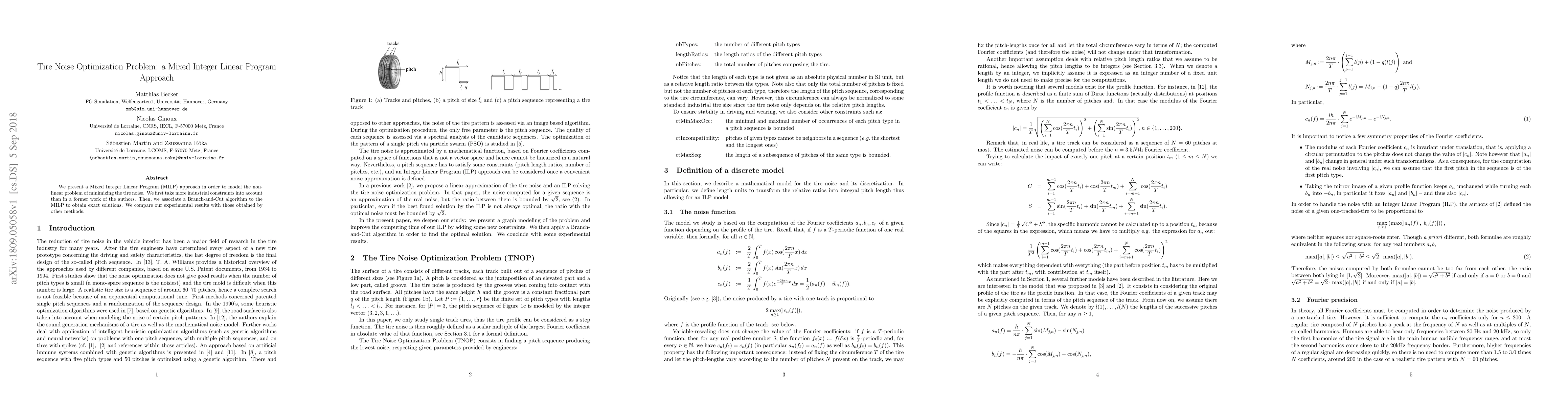 Researchers developed a Mixed Integer Linear Program approach to optimize tire noise, achieving exact solutions with a Branch-and-Cut algorithm, outperforming other methods in experimental results.