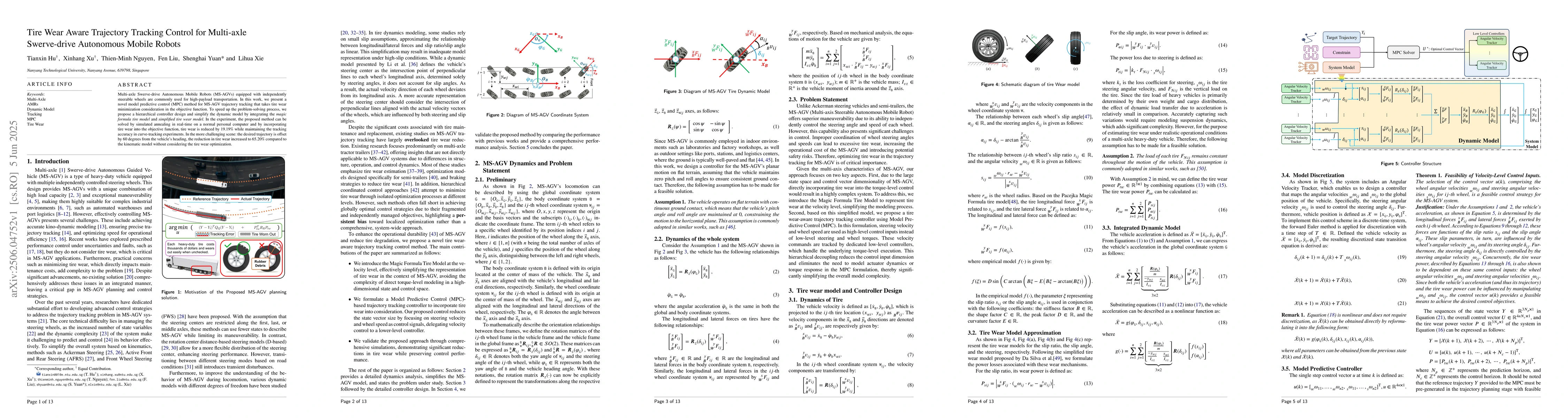 The research presents a novel model predictive control (MPC) method for multi-axle swerve-drive autonomous mobile robots (MS-AGVs) that incorporates tire wear minimization in the objective function. A hierarchical controller design and simplified dynamic models, integrating the magic formula tire model and simplified tire wear model, are proposed to expedite real-time computation on standard hardware.