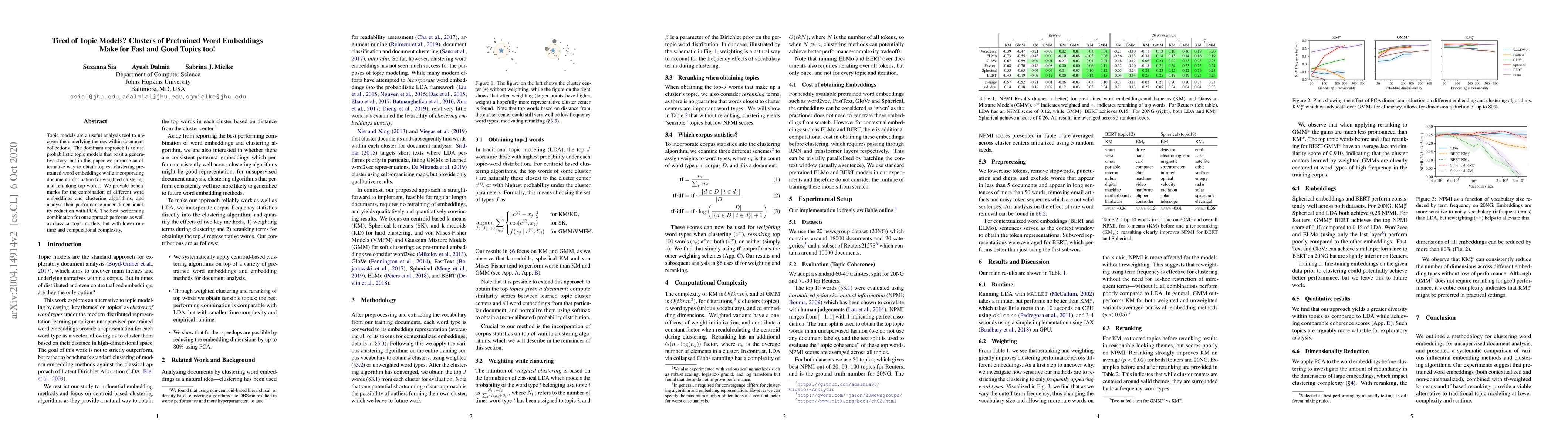 This paper proposes an alternative to traditional probabilistic topic models by clustering pre-trained word embeddings, incorporating document information for weighted clustering, and reranking top words. The approach achieves comparable performance to classical models but with significantly lower runtime and computational complexity.