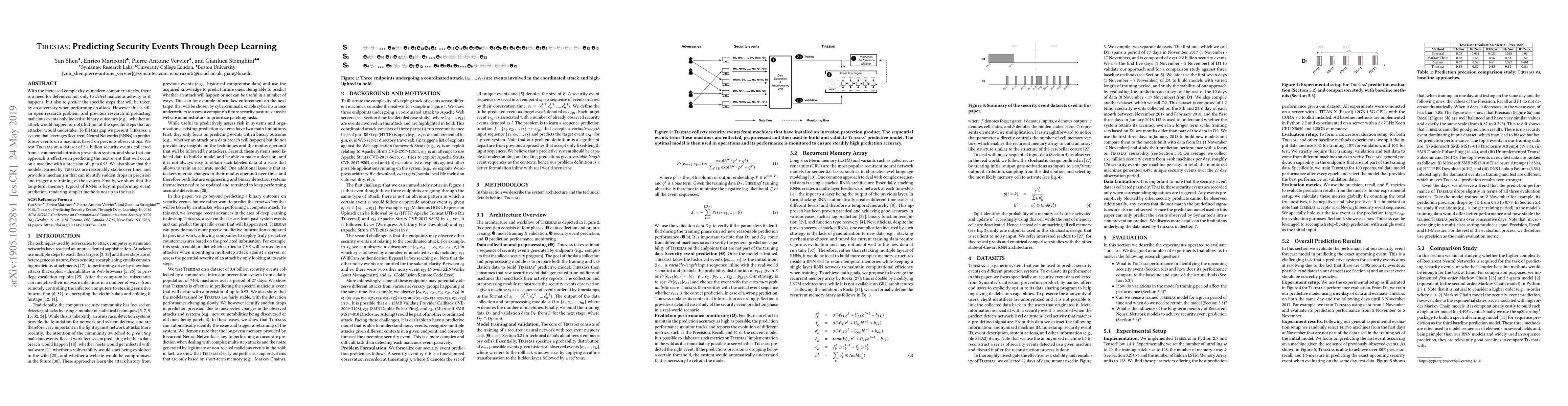 A deep learning model called Tiresias predicts future security events with up to 93% precision, outperforming simpler methods and demonstrating the importance of long-term memory in event prediction.