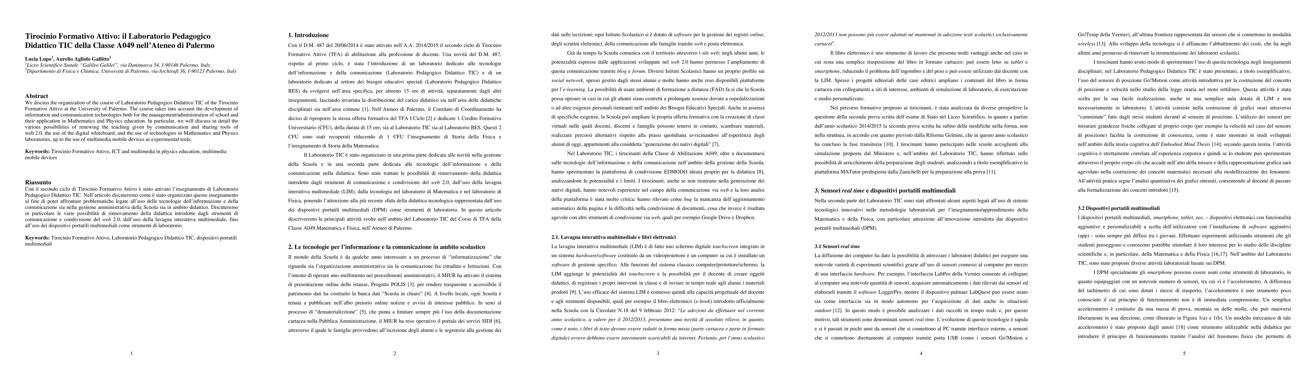 We discuss the organization of the course of Laboratorio Pedagogico Didattico TIC of the Tirocinio Formativo Attivo at the University of Palermo. The course takes into account the development of information and communication technologies both for the management/administration of school and their application in Mathematics and Physics education. In particular, we will discuss in detail the various possibilities of renewing the teaching given by communication and sharing tools of web 2.0, the use of the digital whiteboard, and the use of technologies in Mathematics and Physics laboratories, up to the use of multimedia mobile devices as experimental tools.