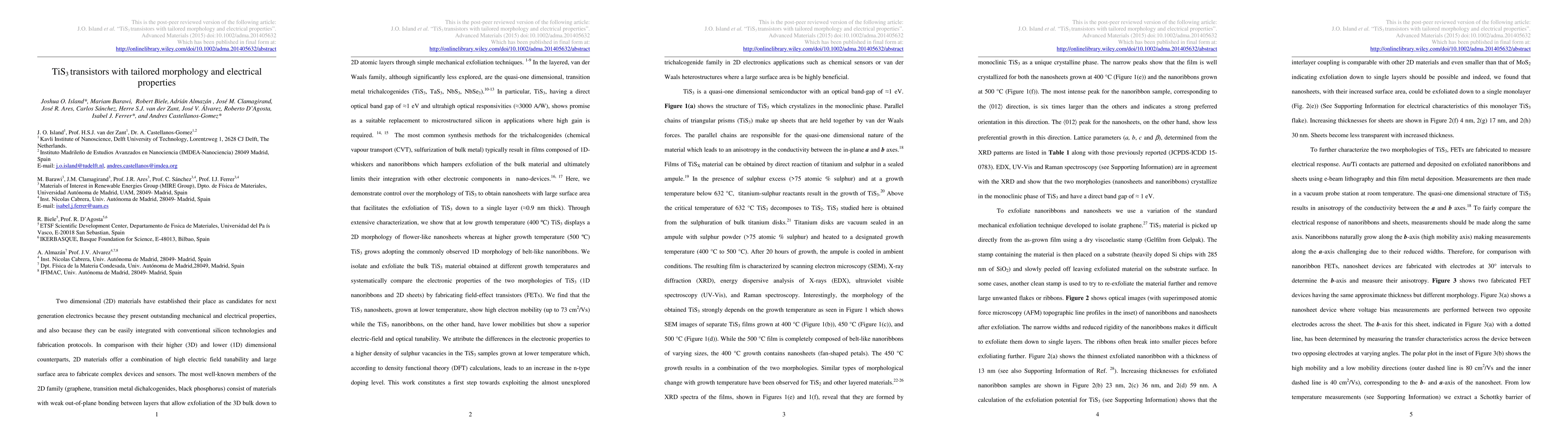 Control over the morphology of TiS3 is demonstrated by synthesizing 1D nanoribbons and 2D nanosheets. The nanosheets can be exfoliated down to a single layer. Through extensive characterization of the two morphologies, differences in the electronic properties are found and attributed to a higher density of sulphur vacancies in nanosheets which, according to density functional theory calculations, leads to an n-type doping.