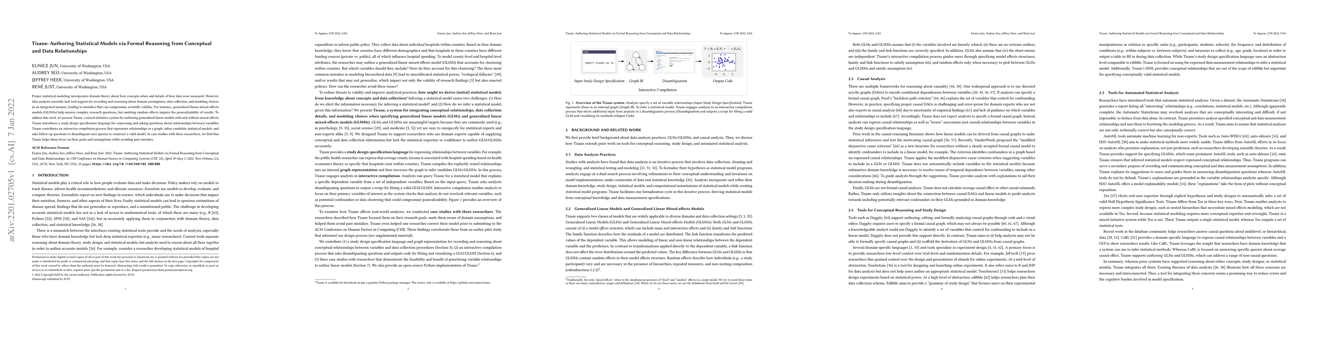 Proper statistical modeling incorporates domain theory about how concepts relate and details of how data were measured. However, data analysts currently lack tool support for recording and reasoning about domain assumptions, data collection, and modeling choices in an integrated manner, leading to mistakes that can compromise scientific validity. For instance, generalized linear mixed-effects models (GLMMs) help answer complex research questions, but omitting random effects impairs the generalizability of results. To address this need, we present Tisane, a mixed-initiative system for authoring generalized linear models with and without mixed-effects. Tisane introduces a study design specification language for expressing and asking questions about relationships between variables. Tisane contributes an interactive compilation process that represents relationships in a graph, infers candidate statistical models, and asks follow-up questions to disambiguate user queries to construct a valid model. In case studies with three researchers, we find that Tisane helps them focus on their goals and assumptions while avoiding past mistakes.