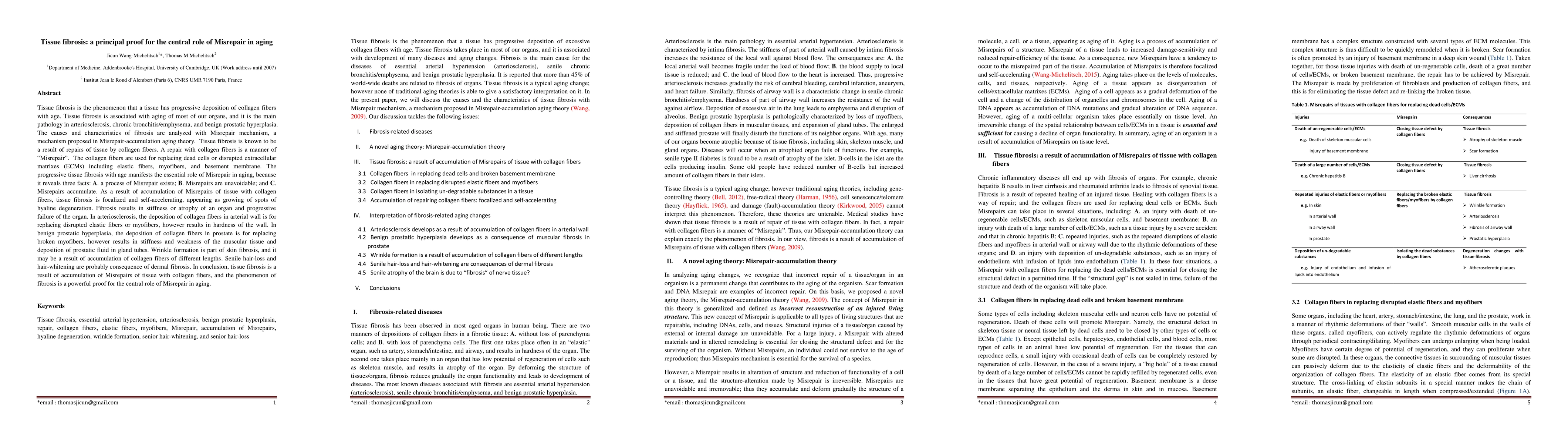 This paper explores tissue fibrosis as a key indicator of the Misrepair mechanism in aging, demonstrating that progressive collagen deposition in tissues with age signifies unavoidable and accumulating Misrepairs. The study concludes that fibrosis, including conditions like arteriosclerosis and skin wrinkling, serves as a principal proof for the central role of Misrepair in aging.