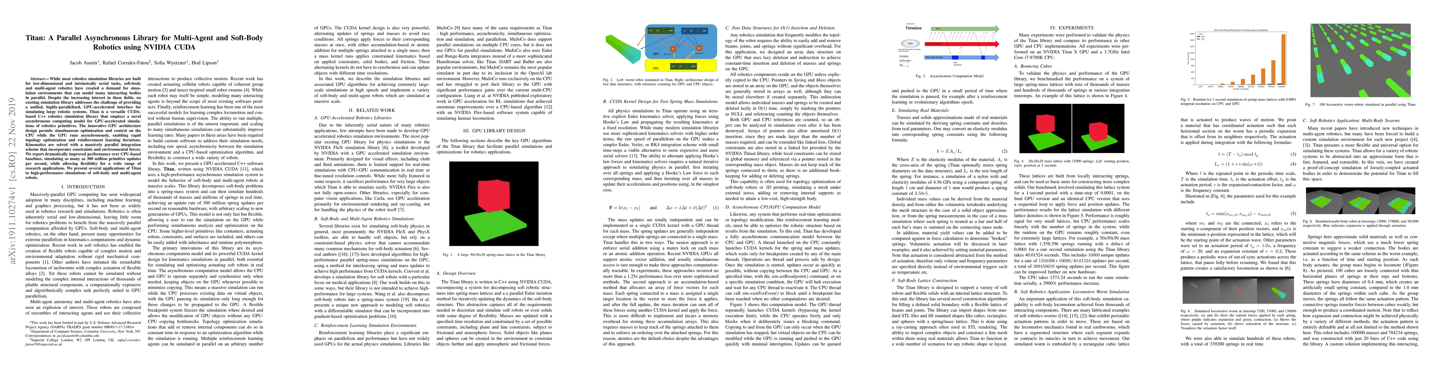 Titan is a parallel asynchronous CUDA-based C++ library designed for GPU-accelerated simulations of multi-agent and soft-body robotics, offering a highly-parallelized interface for large robotic systems. It achieves significant performance improvements, simulating up to 300 million primitive updates per second, and supports diverse research applications.