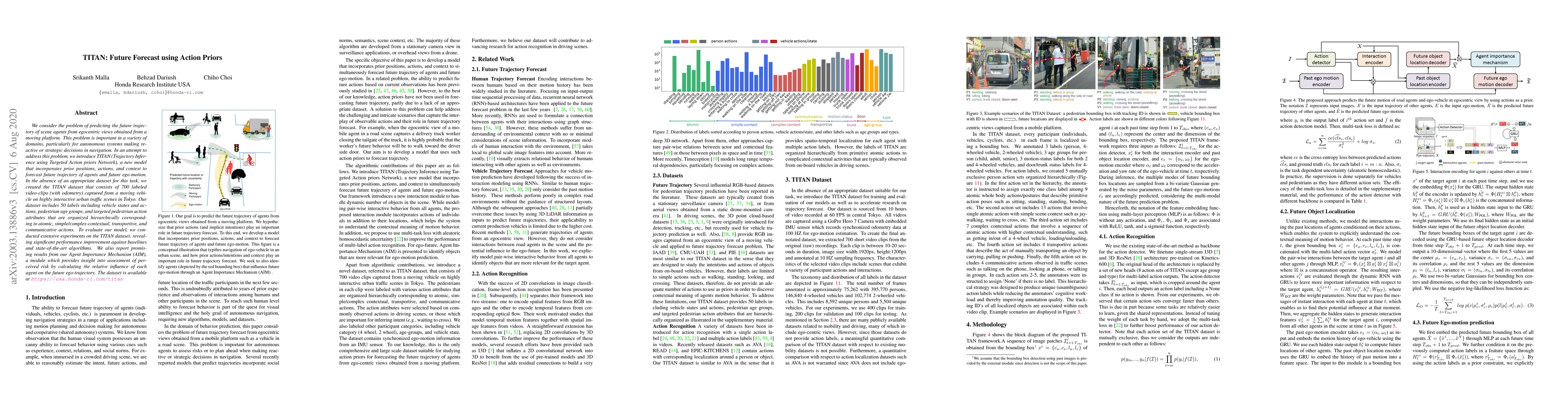We consider the problem of predicting the future trajectory of scene agents from egocentric views obtained from a moving platform. This problem is important in a variety of domains, particularly for autonomous systems making reactive or strategic decisions in navigation. In an attempt to address this problem, we introduce TITAN (Trajectory Inference using Targeted Action priors Network), a new model that incorporates prior positions, actions, and context to forecast future trajectory of agents and future ego-motion. In the absence of an appropriate dataset for this task, we created the TITAN dataset that consists of 700 labeled video-clips (with odometry) captured from a moving vehicle on highly interactive urban traffic scenes in Tokyo. Our dataset includes 50 labels including vehicle states and actions, pedestrian age groups, and targeted pedestrian action attributes that are organized hierarchically corresponding to atomic, simple/complex-contextual, transportive, and communicative actions. To evaluate our model, we conducted extensive experiments on the TITAN dataset, revealing significant performance improvement against baselines and state-of-the-art algorithms. We also report promising results from our Agent Importance Mechanism (AIM), a module which provides insight into assessment of perceived risk by calculating the relative influence of each agent on the future ego-trajectory. The dataset is available at https://usa.honda-ri.com/titan