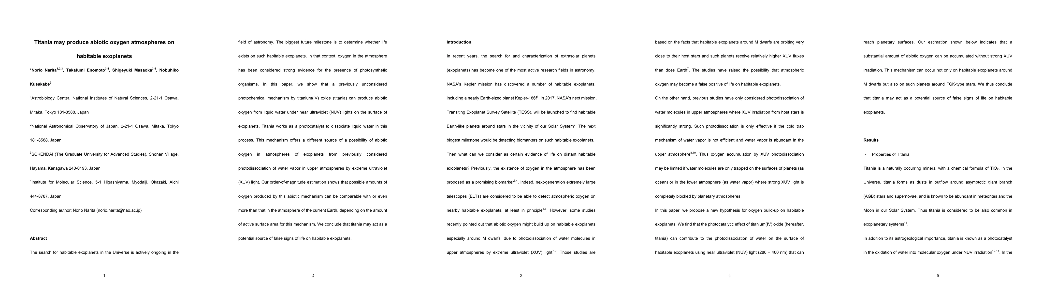 This paper explores a novel photochemical mechanism where titanium(IV) oxide (titania) can produce abiotic oxygen from liquid water under near ultraviolet light, potentially creating false signs of life on habitable exoplanets. This mechanism could generate oxygen comparable to or exceeding Earth's atmospheric levels.
