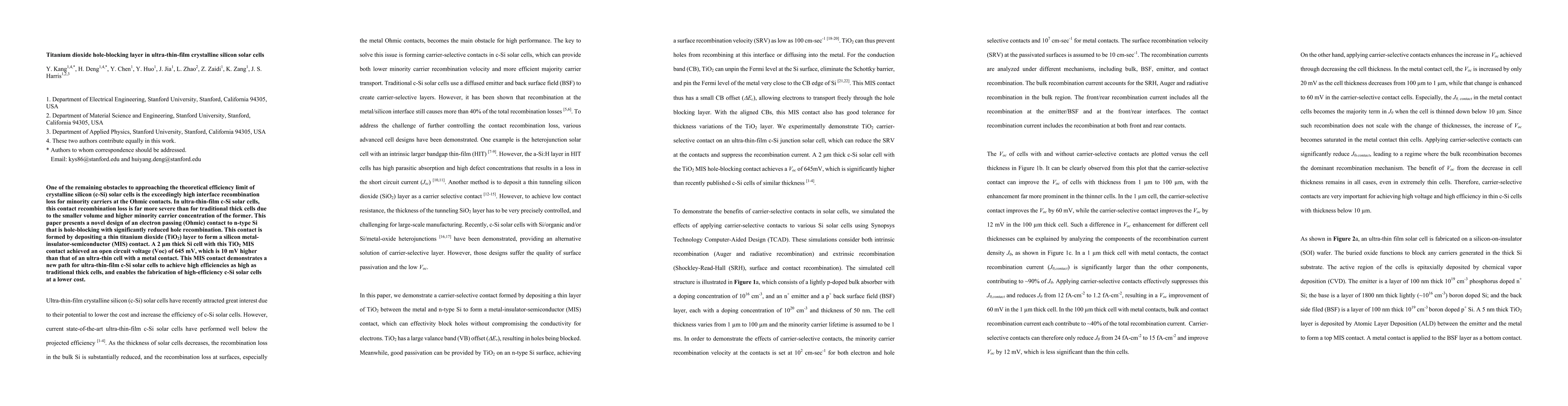 This paper introduces a titanium dioxide (TiO2) hole-blocking layer to reduce interface recombination losses in ultra-thin-film crystalline silicon solar cells, achieving a higher open circuit voltage and suggesting a pathway to high efficiency at lower cost. The TiO2 metal-insulator-semiconductor contact improves performance by minimizing hole recombination.
