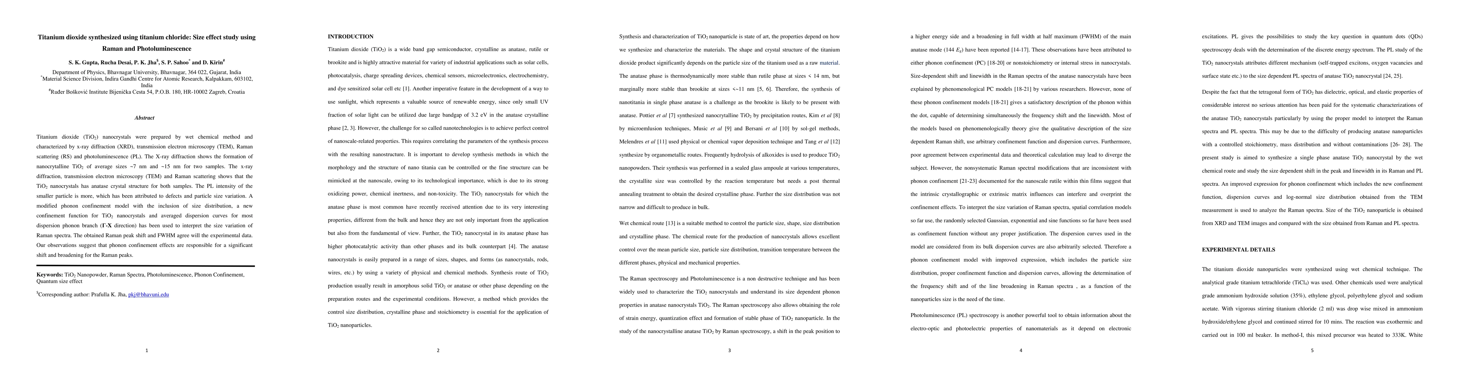 Researchers synthesized titanium dioxide nanocrystals using titanium chloride and studied their size effect on Raman and photoluminescence properties. The study showed that phonon confinement effects cause significant shifts and broadening in the Raman peaks as particle sizes vary.