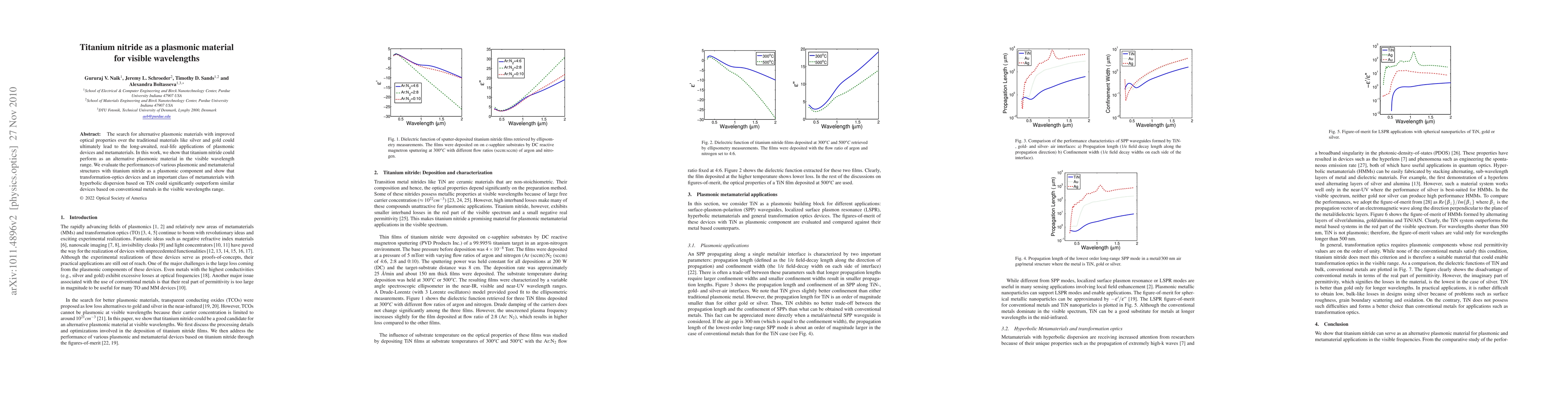 The paper presents a comprehensive analysis of TiN as a plasmonic material for visible wavelengths, demonstrating its advantages in plasmonic metamaterials, SPP waveguides, and transformation optics devices.