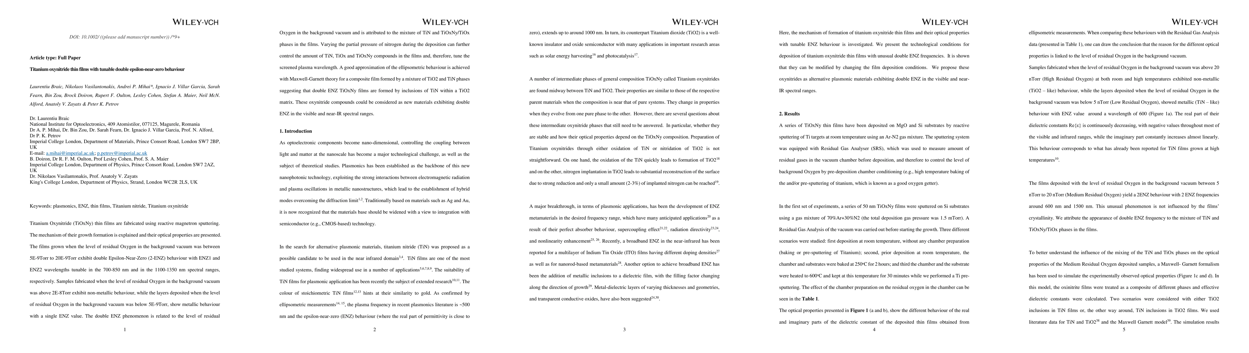 Titanium Oxynitride (TiOxNy) thin films are fabricated using reactive magnetron sputtering. The mechanism of their growth formation is explained and their optical properties are presented. The films grown when the level of residual Oxygen in the background vacuum was between 5E-9Torr to 20E-9Torr exhibit double Epsilon-Near-Zero (2-ENZ) behaviour with ENZ1 and ENZ2 wavelengths tunable in the 700-850 nm and in the 1100-1350 nm spectral ranges, respectively. Samples fabricated when the level of residual Oxygen in the background vacuum was above 2E-8Torr exhibit non-metallic behaviour, while the layers deposited when the level of residual Oxygen in the background vacuum was below 5E-9Torr, show metallic behaviour with a single ENZ value. The double ENZ phenomenon is related to the level of residual Oxygen in the background vacuum and is attributed to the mixture of TiN and TiOxNy/TiOx phases in the films. Varying the partial pressure of nitrogen during the deposition can further control the amount of TiN, TiOx and TiOxNy compounds in the films and, therefore, tune the screened plasma wavelength. A good approximation of the ellipsometric behaviour is achieved with Maxwell-Garnett theory for a composite film formed by a mixture of TiO2 and TiN phases suggesting that double ENZ TiOxNy films are formed by inclusions of TiN within a TiO2 matrix. These oxynitride compounds could be considered as new materials exhibiting double ENZ in the visible and near-IR spectral ranges.
