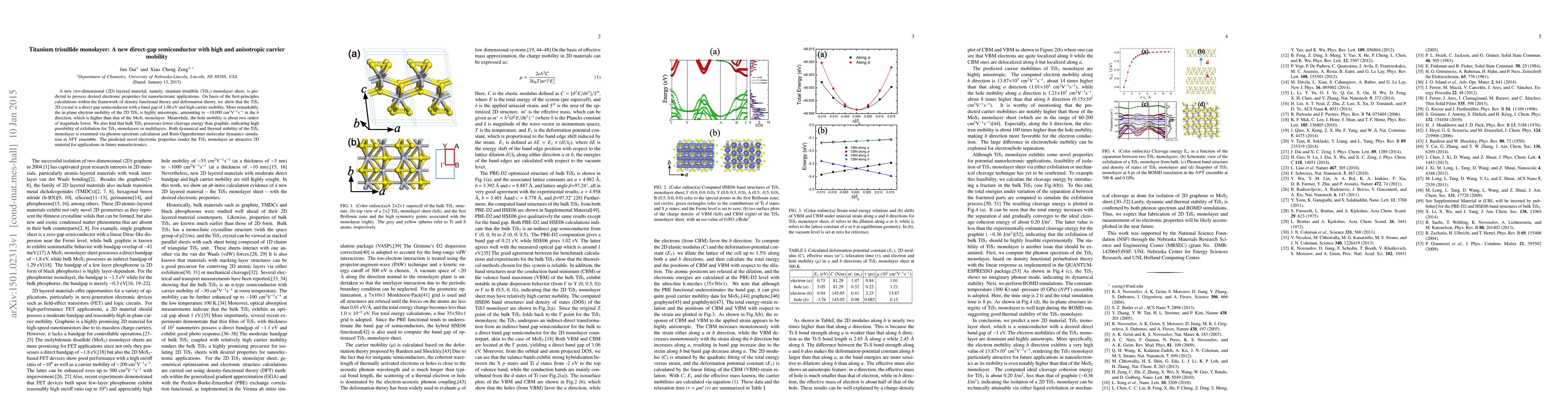 Titanium trisulfide monolayer (TiS$_3$) is identified as a direct-gap semiconductor with a band gap of 1.06 eV and high anisotropic carrier mobility, making it a promising material for nanoelectronic applications. The in-plane electron mobility in the \emph{b} direction exceeds 10,000 cm$^2$V$^{-1}$s$^{-1}$, surpassing that of MoS$_2$ monolayer.