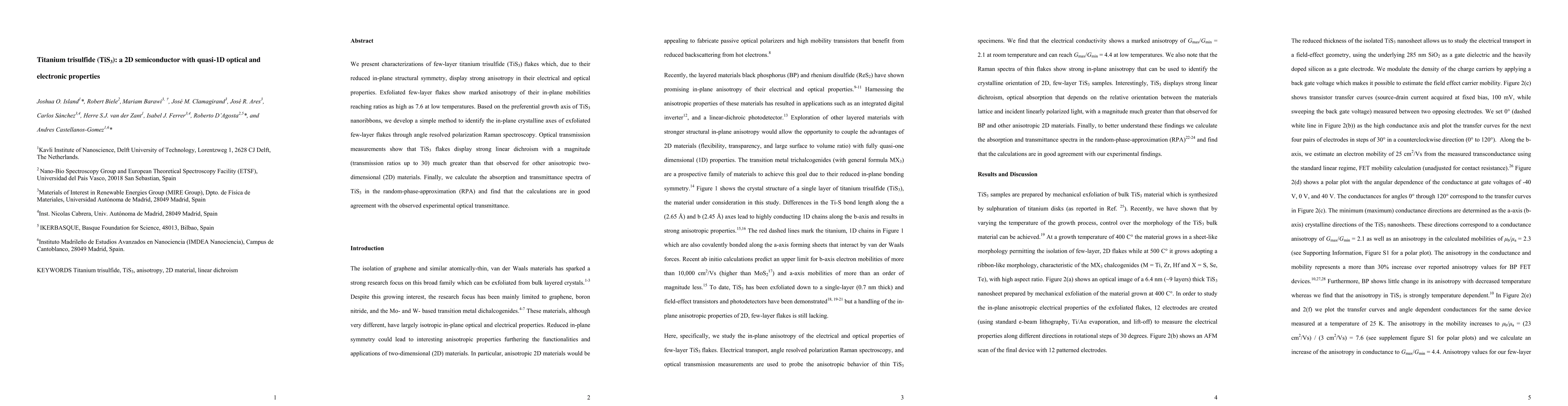 This paper characterizes few-layer titanium trisulfide (TiS3) flakes, revealing strong anisotropy in their electrical and optical properties due to reduced in-plane structural symmetry, with in-plane mobility ratios up to 7.6. The study also develops a method to identify crystalline axes using angle-resolved polarization Raman spectroscopy and finds significant linear dichroism in optical transmission.