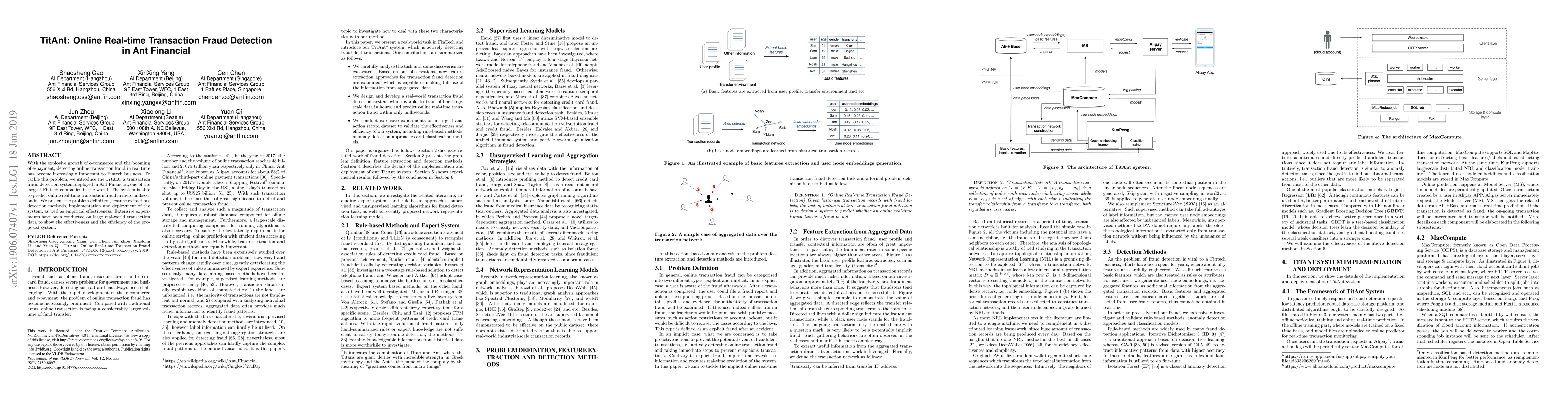 The TitAnt system in Ant Financial enables real-time detection of online transaction fraud with millisecond response times, utilizing advanced feature extraction and detection methods, and has demonstrated effectiveness through extensive experiments on large datasets.