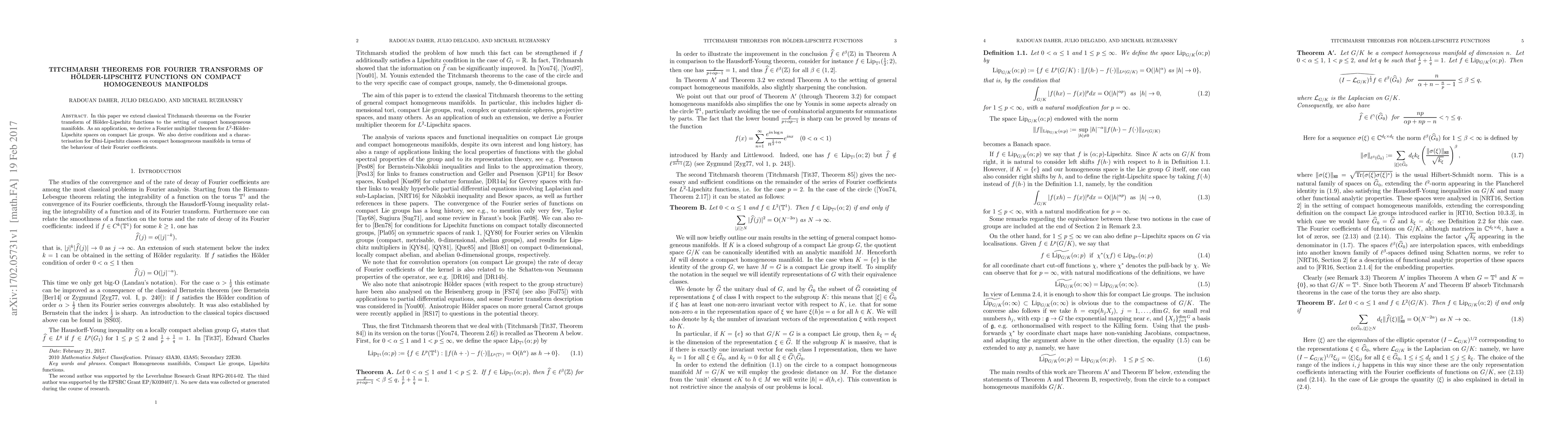 Summary: This paper extends Titchmarsh theorems to Fourier transforms of H\"older-Lipschitz functions on compact homogeneous manifolds, leading to a Fourier multiplier theorem for $L^2$-H\"older-Lipschitz spaces on compact Lie groups, and conditions for Dini-Lipschitz classes based on their Fourier coefficients.