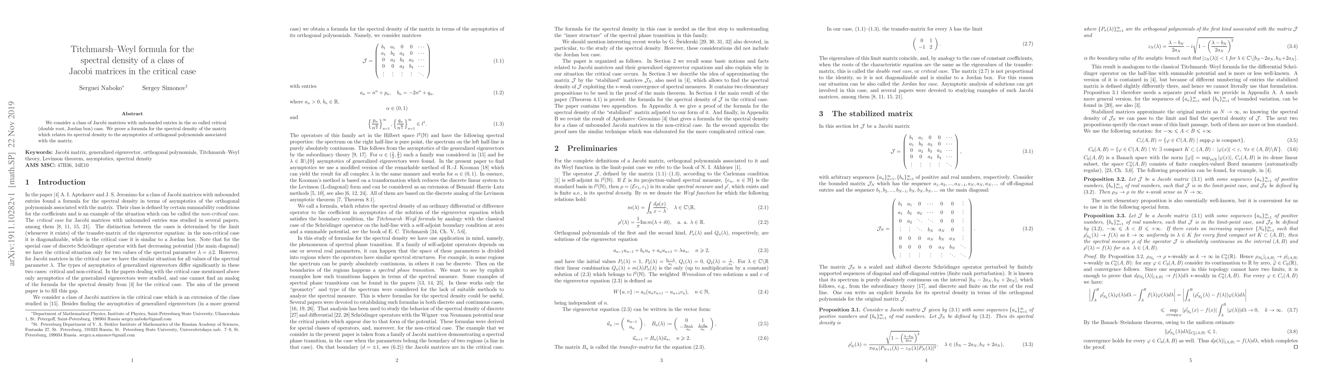 We consider a class of Jacobi matrices with unbounded entries in the so called critical (double root, Jordan box) case. We prove a formula for the spectral density of the matrix which relates its spectral density to the asymptotics of orthogonal polynomials associated with the matrix.