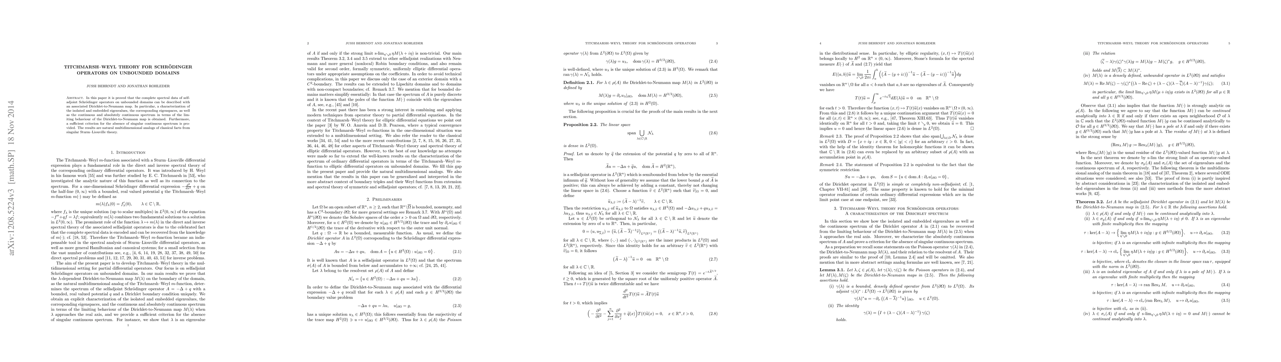 This paper proves that the spectral data of selfadjoint Schrödinger operators on unbounded domains can be characterized using an associated Dirichlet-to-Neumann map, providing insights into isolated and embedded eigenvalues, eigenspaces, and the continuous and absolutely continuous spectrum. It also offers a criterion for the absence of singular continuous spectrum, extending classical Sturm-Liouville theory.
