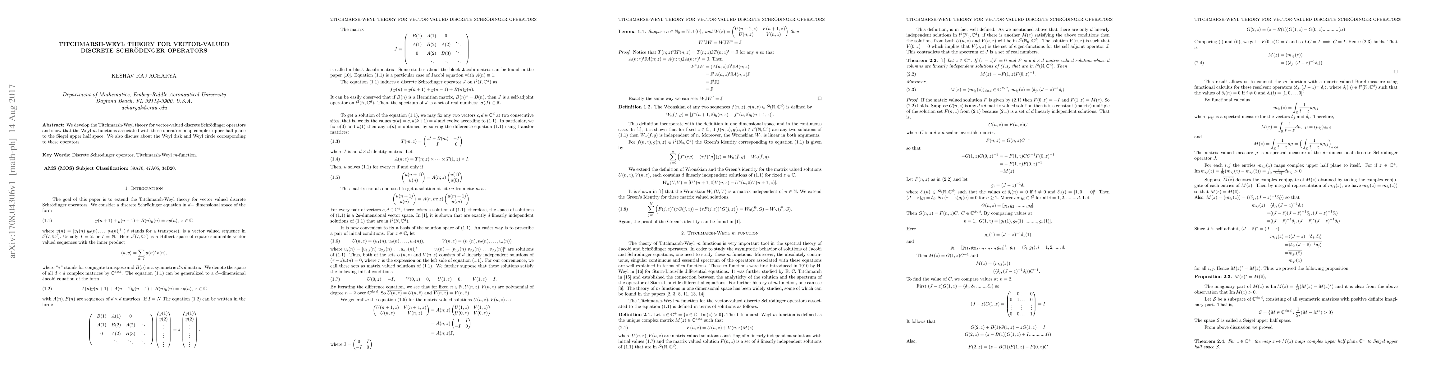 This paper develops Titchmarsh-Weyl theory for vector-valued discrete Schrödinger operators, demonstrating that their Weyl $m$ functions map the complex upper half plane to the Siegel upper half space, and explores the associated Weyl disk and circle.