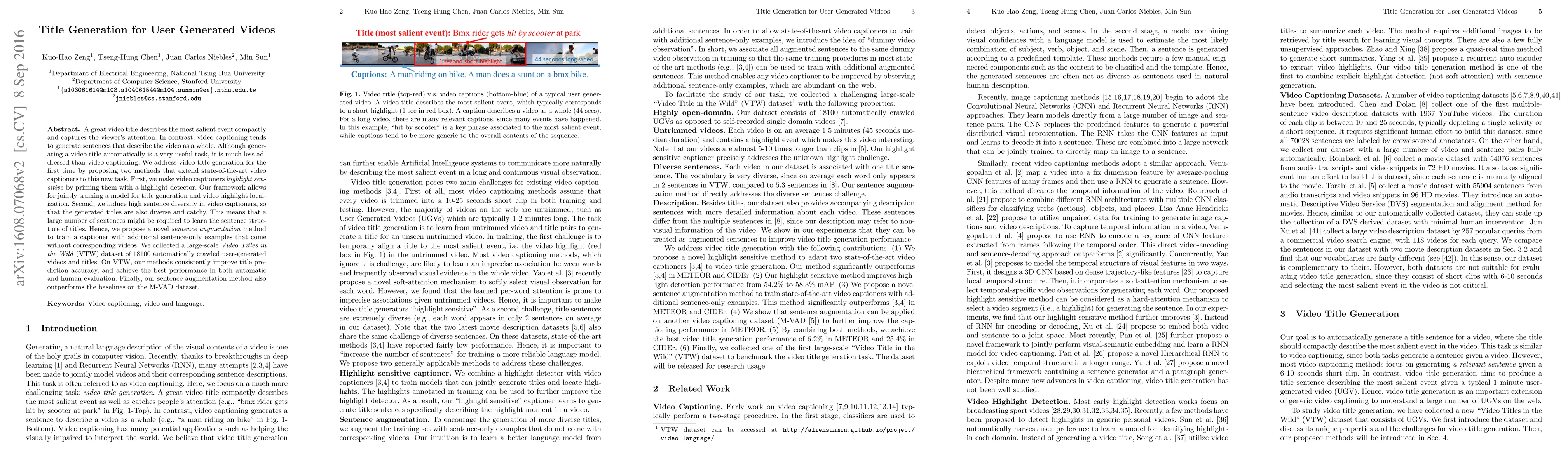 This paper proposes two methods to generate video titles by extending state-of-the-art video captioners. It introduces a highlight detector to prime captioners and a sentence augmentation method to improve sentence diversity, achieving better title prediction accuracy on a new dataset of 18,100 user-generated videos and titles.