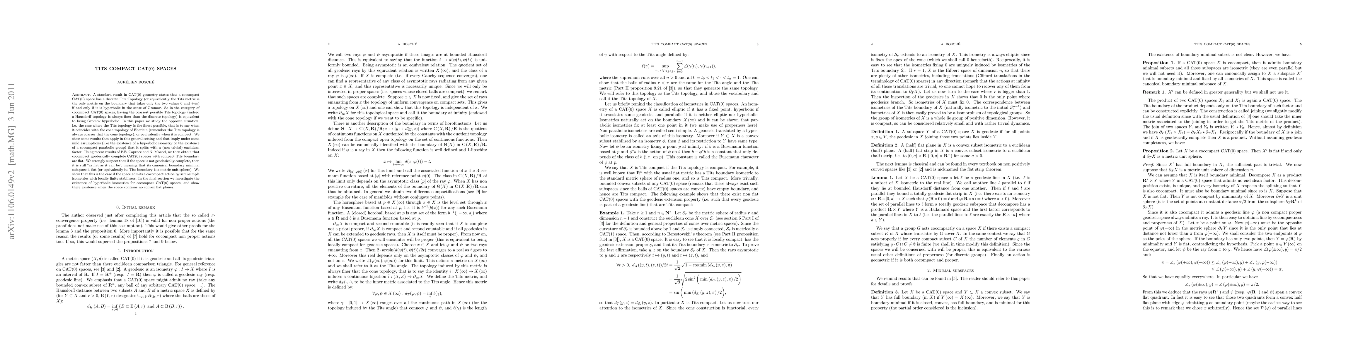 Summary: The paper examines CAT(0) metric spaces with compact Tits boundaries, proving that if the isometry group acts cocompactly, the space is "as flat as possible." It also proves the existence of either hyperbolic isometries or convex embedded flat planes in cocompact CAT(0) spaces.