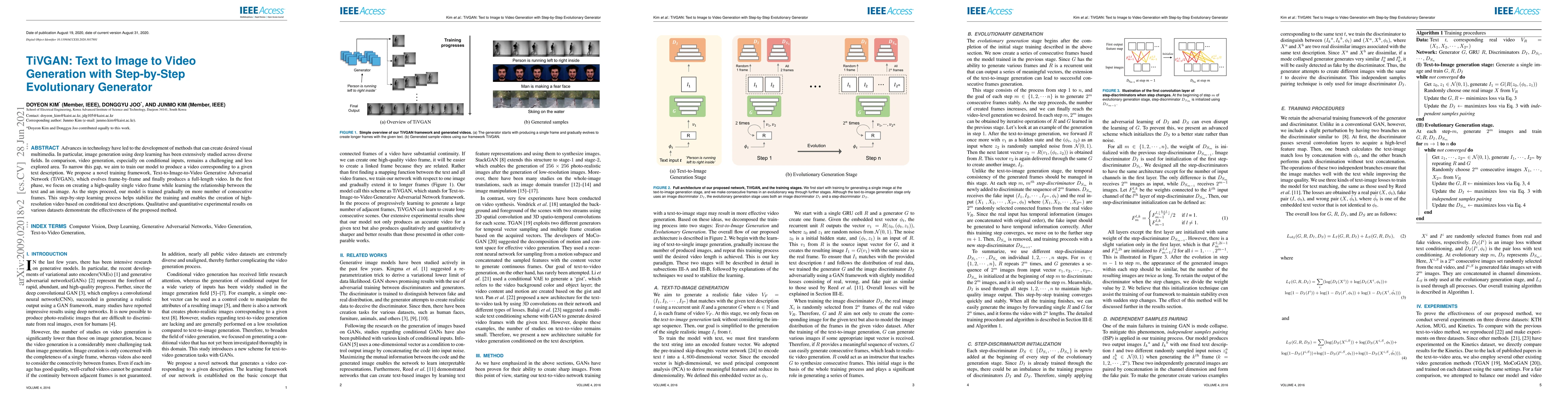 TiVGAN is a novel framework for generating videos from text descriptions by evolving frame-by-frame through a step-by-step training process. The model first creates high-quality single frames, then gradually trains on consecutive frames to produce high-resolution videos, demonstrating effectiveness through qualitative and quantitative results.
