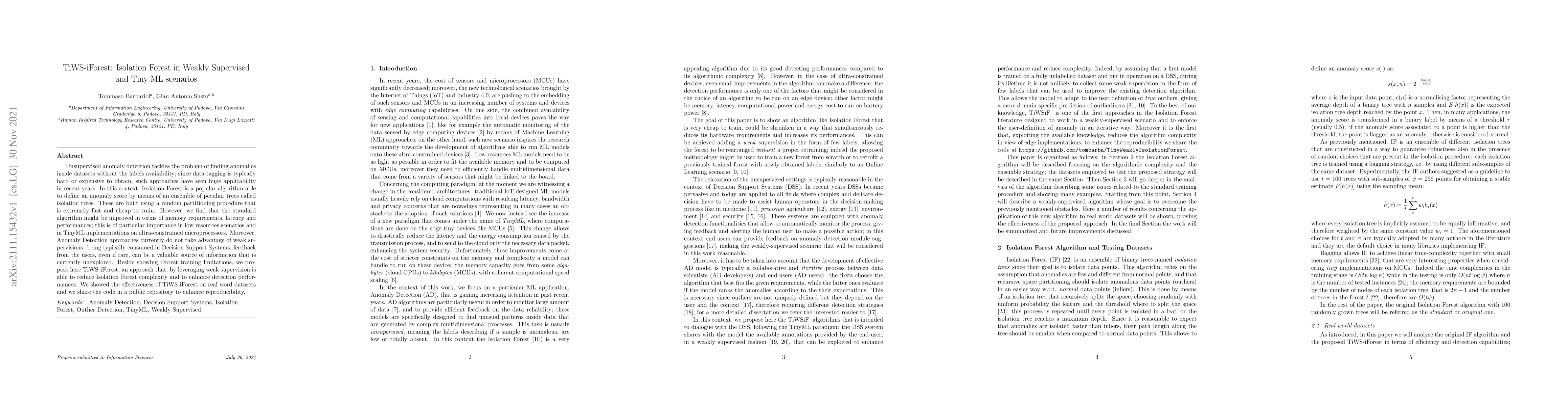 Unsupervised anomaly detection tackles the problem of finding anomalies inside datasets without the labels availability; since data tagging is typically hard or expensive to obtain, such approaches have seen huge applicability in recent years. In this context, Isolation Forest is a popular algorithm able to define an anomaly score by means of an ensemble of peculiar trees called isolation trees. These are built using a random partitioning procedure that is extremely fast and cheap to train. However, we find that the standard algorithm might be improved in terms of memory requirements, latency and performances; this is of particular importance in low resources scenarios and in TinyML implementations on ultra-constrained microprocessors. Moreover, Anomaly Detection approaches currently do not take advantage of weak supervisions: being typically consumed in Decision Support Systems, feedback from the users, even if rare, can be a valuable source of information that is currently unexplored. Beside showing iForest training limitations, we propose here TiWS-iForest, an approach that, by leveraging weak supervision is able to reduce Isolation Forest complexity and to enhance detection performances. We showed the effectiveness of TiWS-iForest on real word datasets and we share the code in a public repository to enhance reproducibility.