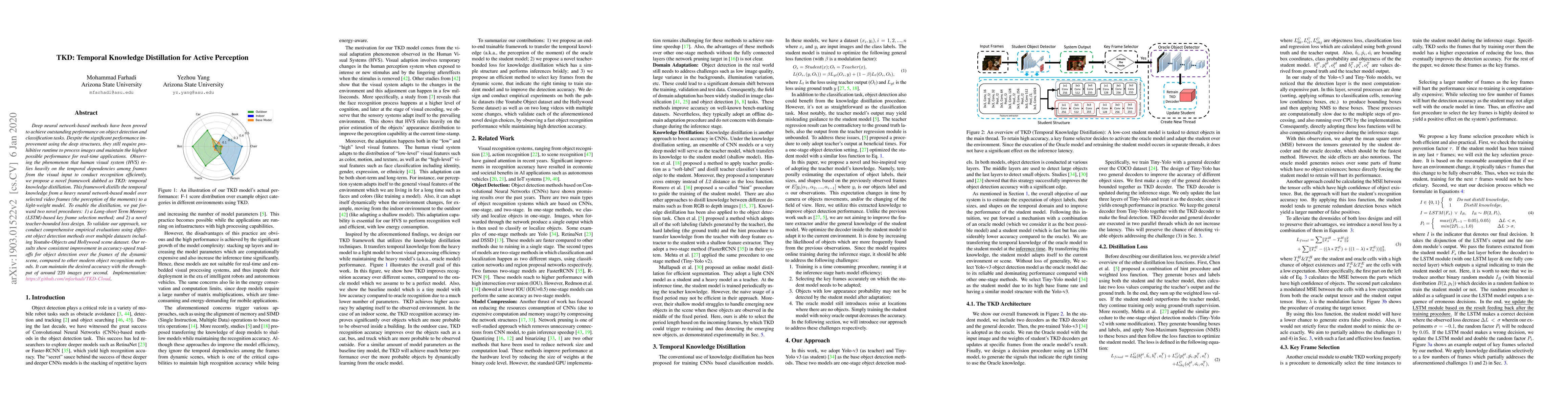 Deep neural networks based methods have been proved to achieve outstanding performance on object detection and classification tasks. Despite significant performance improvement, due to the deep structures, they still require prohibitive runtime to process images and maintain the highest possible performance for real-time applications. Observing the phenomenon that human vision system (HVS) relies heavily on the temporal dependencies among frames from the visual input to conduct recognition efficiently, we propose a novel framework dubbed as TKD: temporal knowledge distillation. This framework distills the temporal knowledge from a heavy neural networks based model over selected video frames (the perception of the moments) to a light-weight model. To enable the distillation, we put forward two novel procedures: 1) an Long-short Term Memory (LSTM) based key frame selection method; and 2) a novel teacher-bounded loss design. To validate, we conduct comprehensive empirical evaluations using different object detection methods over multiple datasets including Youtube-Objects and Hollywood scene dataset. Our results show consistent improvement in accuracy-speed trad-offs for object detection over the frames of the dynamic scene, compare to other modern object recognition methods.
