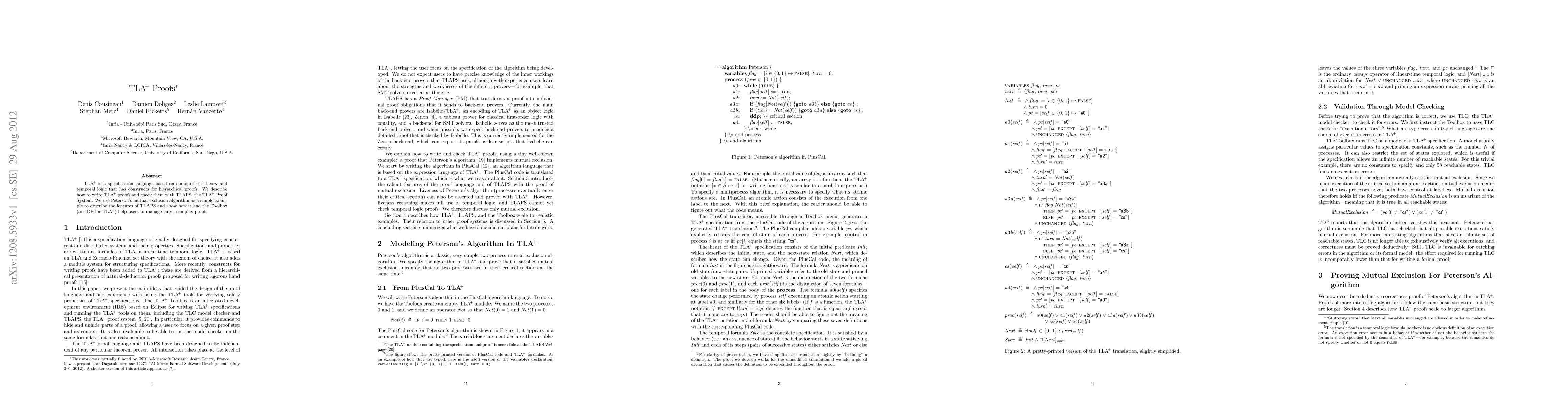TLA+ is a formal specification language for modeling systems, and TLAPS is its proof system for verifying correctness. This paper demonstrates the use of TLA+ and TLAPS to formally verify Peterson's mutual exclusion algorithm, highlighting the system's capabilities in managing complex proofs.