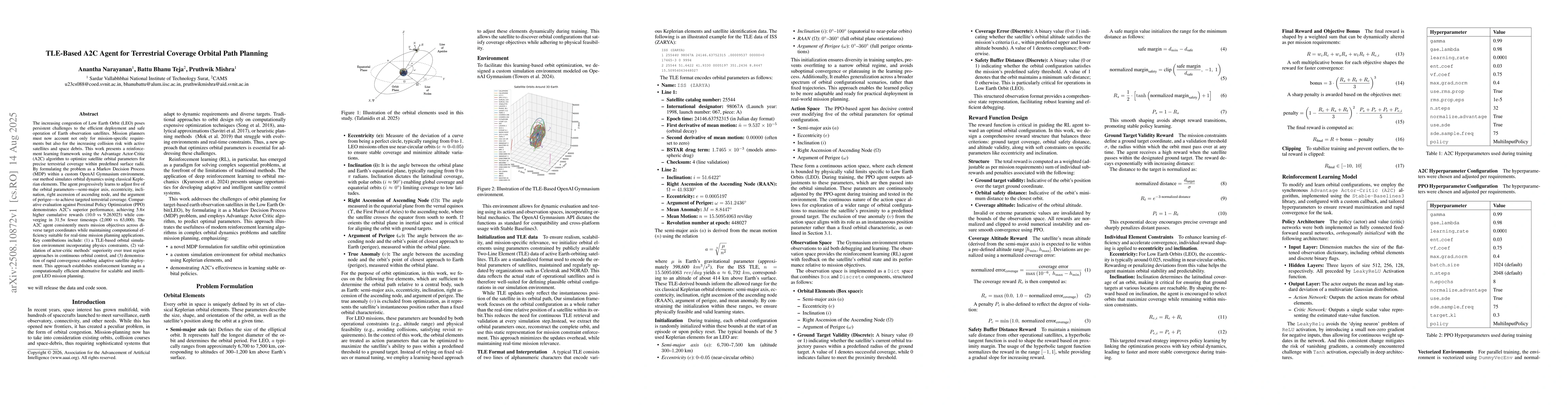 The increasing congestion of Low Earth Orbit (LEO) poses persistent challenges to the efficient deployment and safe operation of Earth observation satellites. Mission planners must now account not only for mission-specific requirements but also for the increasing collision risk with active satellites and space debris. This work presents a reinforcement learning framework using the Advantage Actor-Critic (A2C) algorithm to optimize satellite orbital parameters for precise terrestrial coverage within predefined surface radii. By formulating the problem as a Markov Decision Process (MDP) within a custom OpenAI Gymnasium environment, our method simulates orbital dynamics using classical Keplerian elements. The agent progressively learns to adjust five of the orbital parameters - semi-major axis, eccentricity, inclination, right ascension of ascending node, and the argument of perigee-to achieve targeted terrestrial coverage. Comparative evaluation against Proximal Policy Optimization (PPO) demonstrates A2C's superior performance, achieving 5.8x higher cumulative rewards (10.0 vs 9.263025) while converging in 31.5x fewer timesteps (2,000 vs 63,000). The A2C agent consistently meets mission objectives across diverse target coordinates while maintaining computational efficiency suitable for real-time mission planning applications. Key contributions include: (1) a TLE-based orbital simulation environment incorporating physics constraints, (2) validation of actor-critic methods' superiority over trust region approaches in continuous orbital control, and (3) demonstration of rapid convergence enabling adaptive satellite deployment. This approach establishes reinforcement learning as a computationally efficient alternative for scalable and intelligent LEO mission planning.