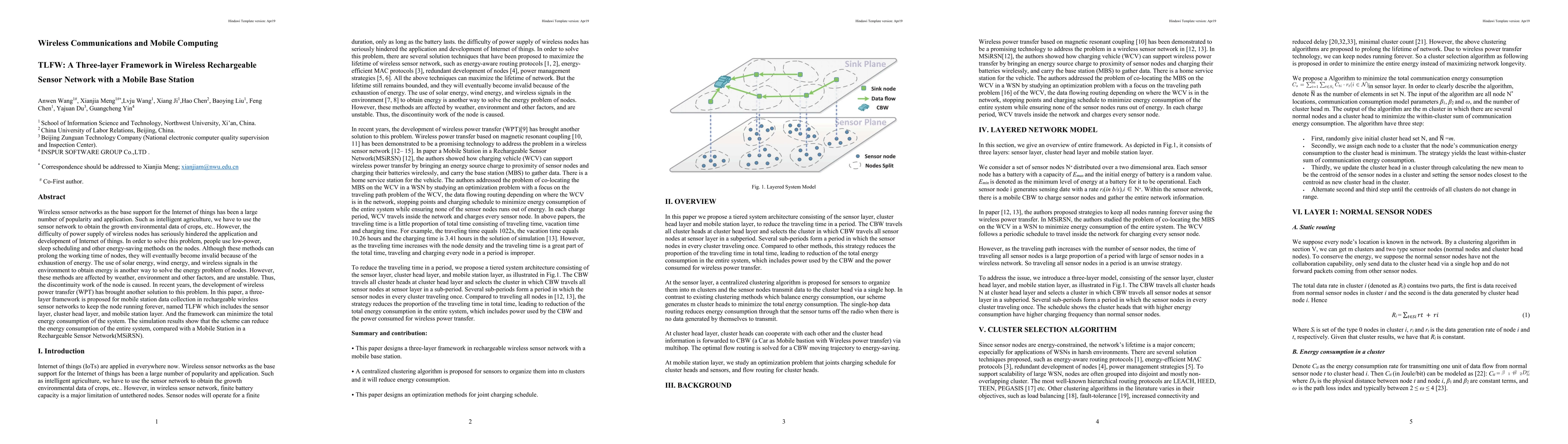 This paper proposes a three-layer framework, TLFW, for wireless rechargeable sensor networks with a mobile base station to address the energy supply issue. The framework includes sensor, cluster head, and mobile station layers, aiming to minimize total energy consumption and ensure continuous node operation. Simulation results demonstrate reduced overall system energy usage compared to existing methods.