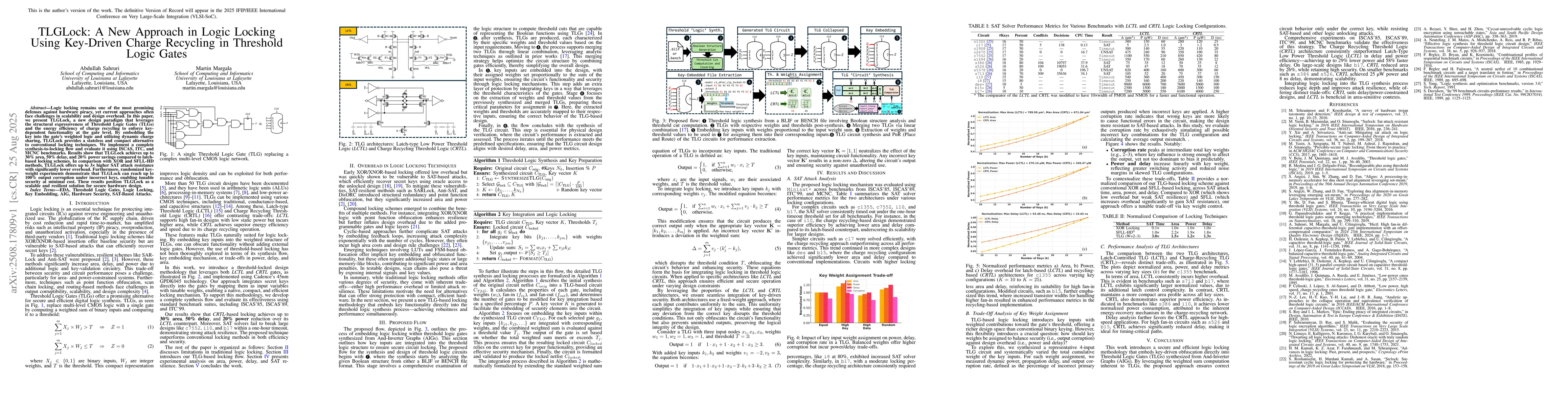 Logic locking remains one of the most promising defenses against hardware piracy, yet current approaches often face challenges in scalability and design overhead. In this paper, we present TLGLock, a new design paradigm that leverages the structural expressiveness of Threshold Logic Gates (TLGs) and the energy efficiency of charge recycling to enforce key-dependent functionality at the gate level. By embedding the key into the gate's weighted logic and utilizing dynamic charge sharing, TLGLock provides a stateless and compact alternative to conventional locking techniques. We implement a complete synthesis-to-locking flow and evaluate it using ISCAS, ITC, and MCNC benchmarks. Results show that TLGLock achieves up to 30% area, 50% delay, and 20% power savings compared to latch-based locking schemes. In comparison with XOR and SFLL-HD methods, TLGLock offers up to 3x higher SAT attack resistance with significantly lower overhead. Furthermore, randomized key-weight experiments demonstrate that TLGLock can reach up to 100% output corruption under incorrect keys, enabling tunable security at minimal cost. These results position TLGLock as a scalable and resilient solution for secure hardware design.