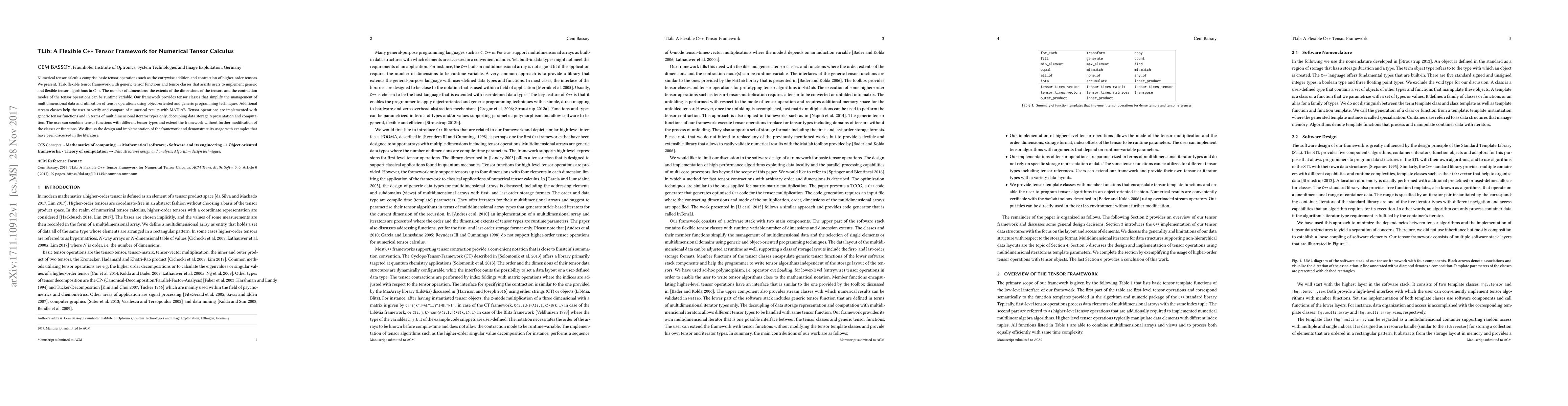 TLib is a flexible C++ tensor framework for numerical tensor calculus, implementing generic tensor functions and classes to assist in implementing flexible tensor algorithms. It supports runtime variable number of dimensions, tensor dimensions' extents, and contraction modes of tensor operations.