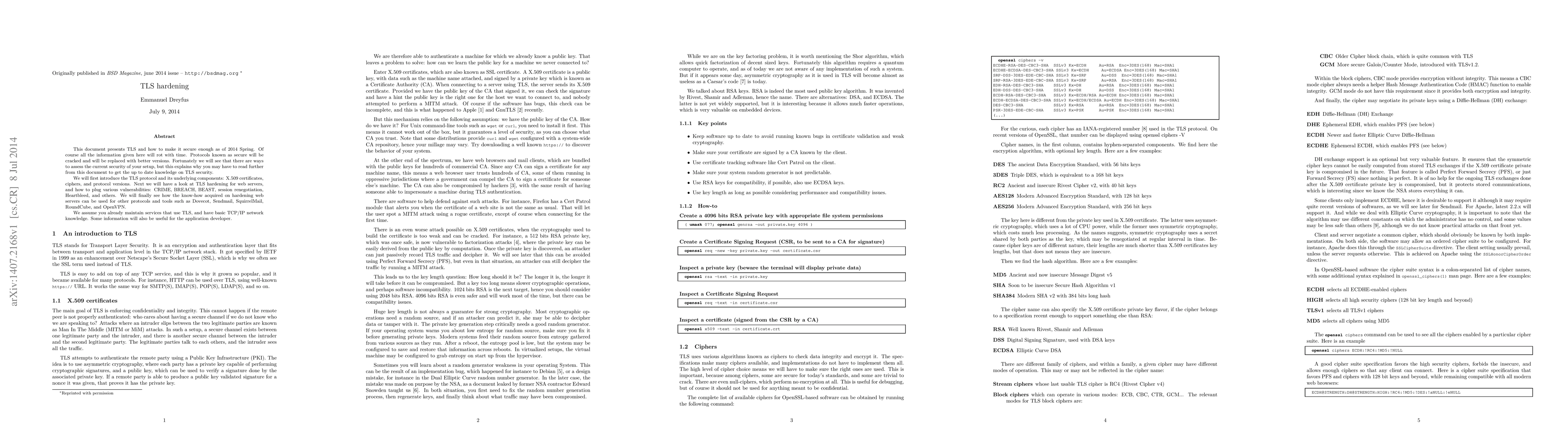 This document presents TLS and how to make it secure enough as of 2014 Spring. Of course all the information given here will rot with time. Protocols known as secure will be cracked and will be replaced with better versions. Fortunately we will see that there are ways to assess the current security of your setup, but this explains why you may have to read further from this document to get the up to date knowledge on TLS security. We will first introduce the TLS protocol and its underlying components: X.509 certificates, ciphers, and protocol versions. Next we will have a look at TLS hardening for web servers, and how to plug various vulnerabilities: CRIME, BREACH, BEAST, session renegotiation, Heartbleed, and others. We will finally see how the know-how acquired on hardening web servers can be used for other protocols and tools such as Dovecot, Sendmail, SquirrelMail, RoundCube, and OpenVPN. We assume you already maintain services that use TLS, and have basic TCP/IP network knowledge. Some information will also be useful for the application developer.