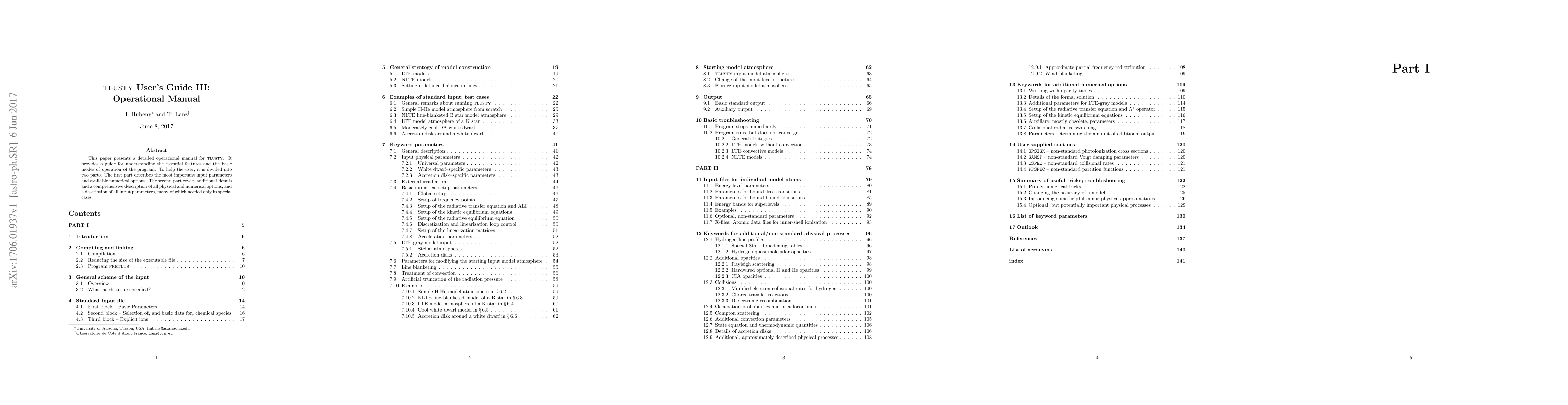 This paper offers a comprehensive operational manual for TLUSTY, detailing essential features and basic operational modes. It is divided into two parts: the first outlines key input parameters and numerical options, while the second provides in-depth coverage of all physical and numerical options and special case input parameters.