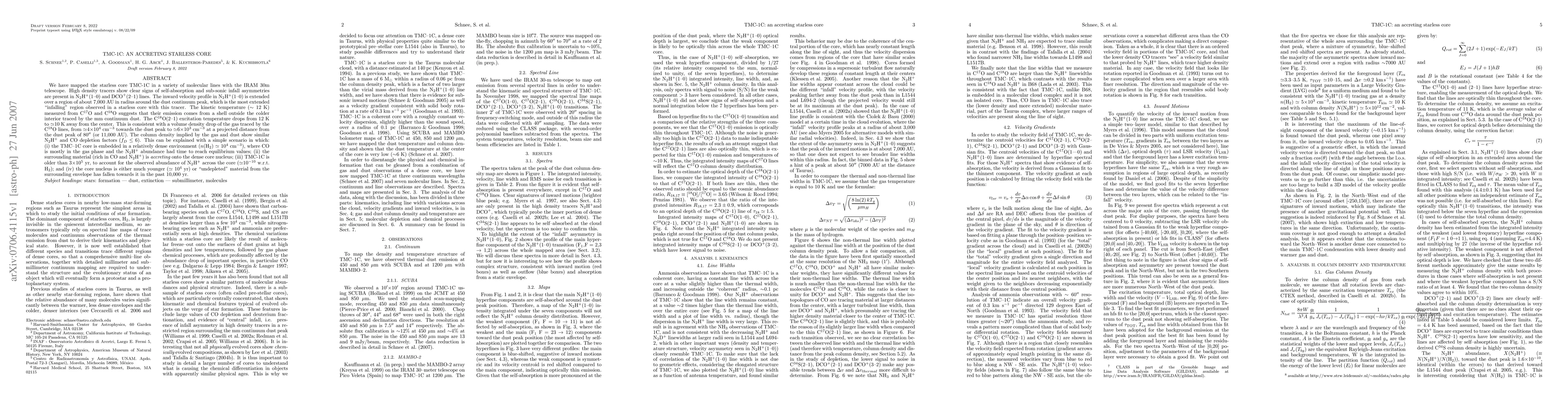 The study of TMC-1C, a starless core, reveals self-absorption and sub-sonic infall using molecular line tracers. Observations suggest an accreting core with a dense environment, CO mostly in gas phase, and N2H+ abundance at equilibrium. The core nucleus is proposed to be either young or recently accreted material-enriched, with a kinetic temperature of ~12K and density dropping from ~4x10^4 to ~6x10^3 cm^-3 over 11,000 AU.