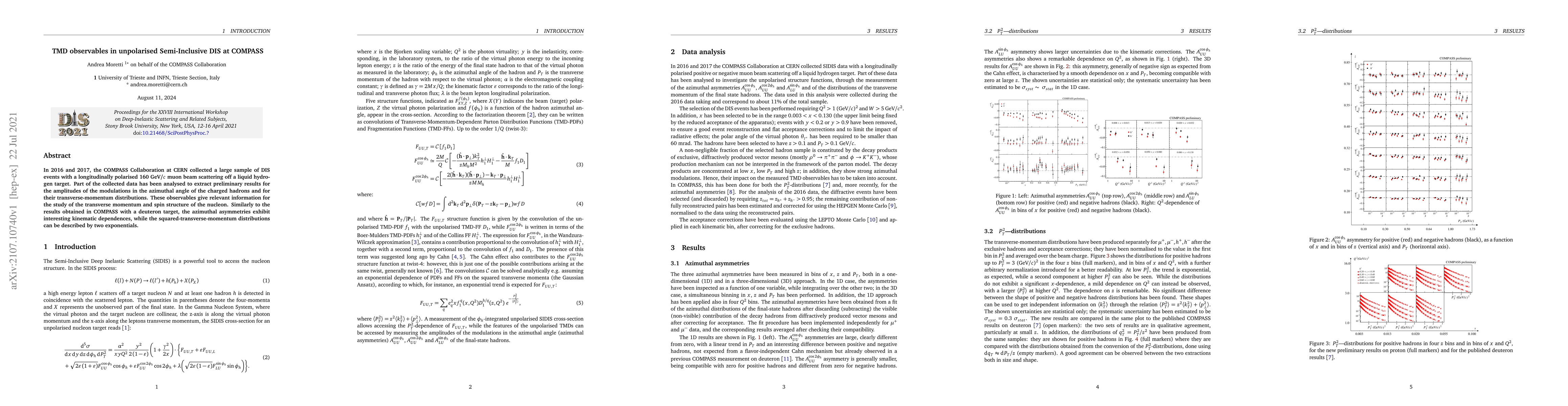 This paper reports preliminary results from the COMPASS Collaboration on TMD observables in unpolarised semi-inclusive DIS, revealing significant azimuthal asymmetries and transverse-momentum distributions described by two exponential functions, providing insights into the nucleon's spin structure.