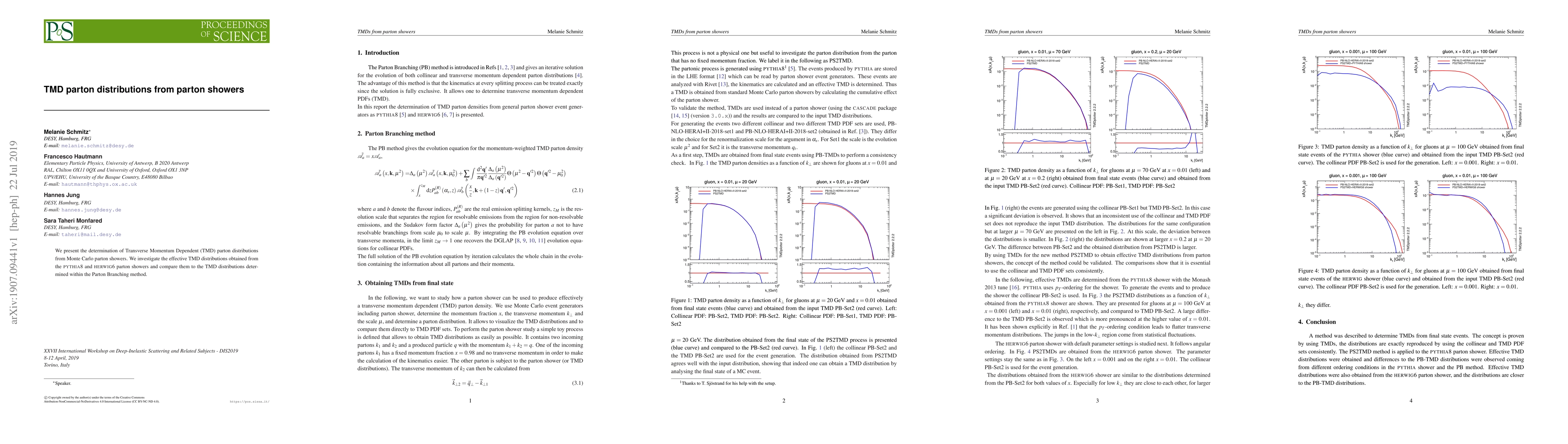 The research determines TMD parton distributions from Monte Carlo parton showers, specifically PYTHIA8 and HERWIG6, and compares them to TMD distributions from the Parton Branching method.