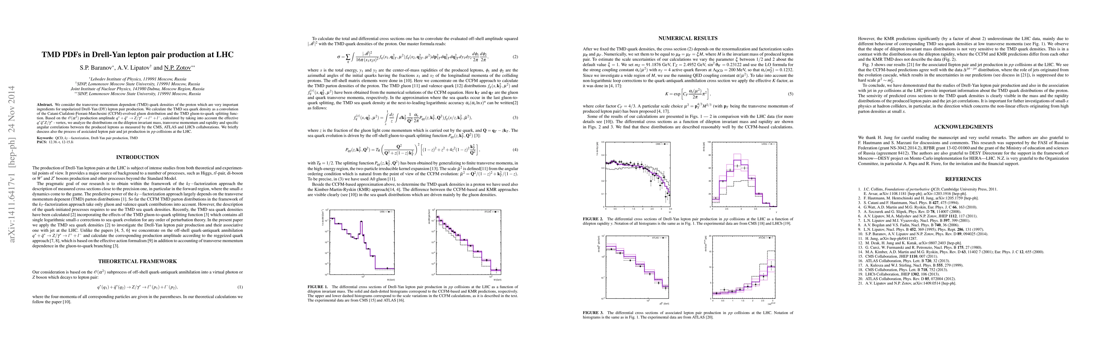 This paper investigates the transverse momentum dependent (TMD) quark densities in unpolarized Drell-Yan lepton pair production at the LHC, calculating the TMD sea quark density through a convolution of evolved gluon distributions and TMD splitting functions. The study analyzes angular correlations and distributions of dileptons, alongside associated lepton pair and jet production in proton-proton collisions.