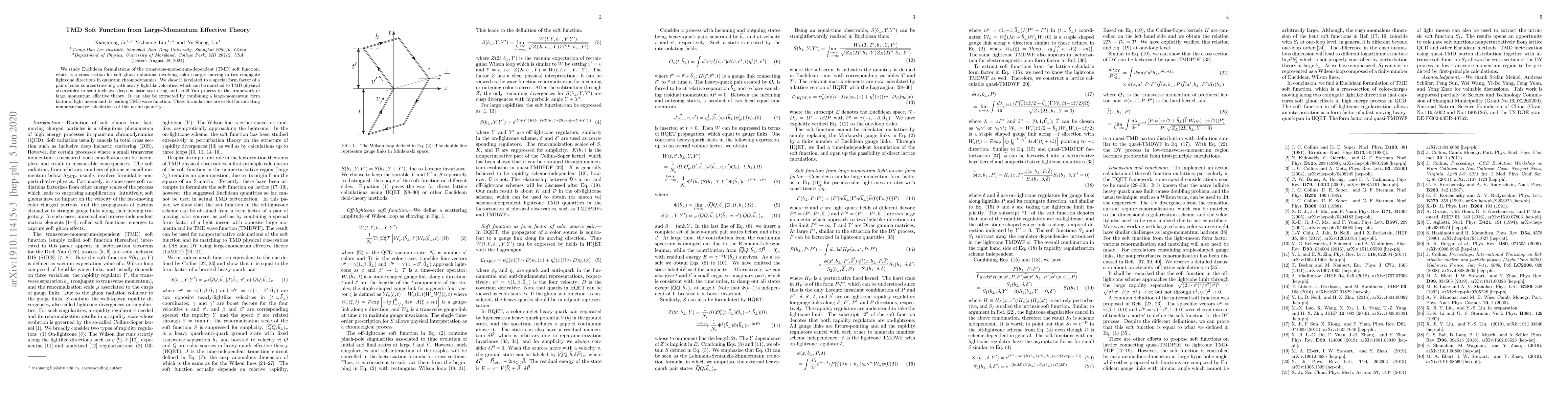 We study Euclidean formulations of the transverse-momentum-dependent (TMD) soft function, which is a cross section for soft gluon radiations involving color charges moving in two conjugate lightcone directions in quantum chromodynamics. We show it is related to a special form factor of a pair of color sources traveling with nearly-lightlike velocities, which can be matched to TMD physical observables in semi-inclusive deep-inelastic scattering and Drell-Yan process in the framework of large momentum effective theory. It can also be extracted by combining a large-momentum form factor of light meson and its leading TMD wave function. These formulations are useful for initiating nonperturbative calculations of this useful quantity.
