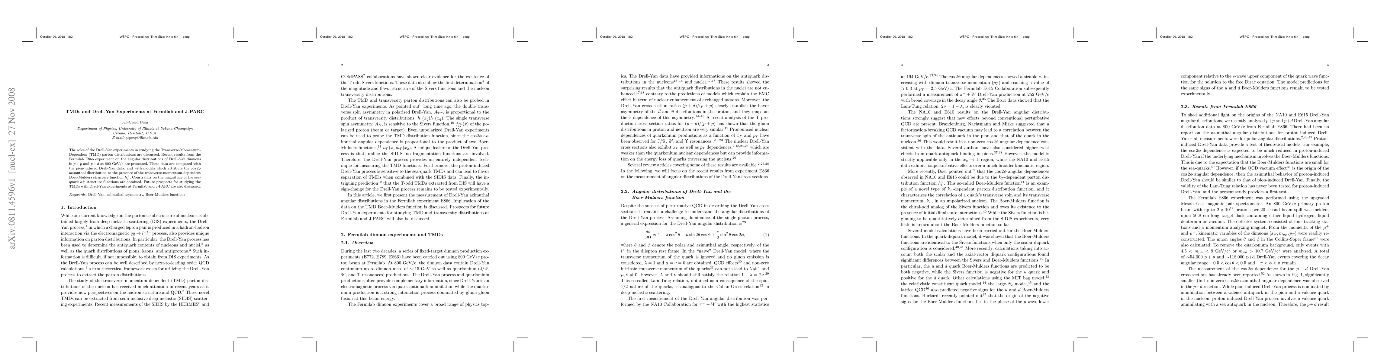 This paper discusses the Drell-Yan experiments' role in exploring Transverse-Momentum-Dependent (TMD) parton distributions, presenting results from Fermilab's E866 experiment on angular distributions of Drell-Yan dimuons, and comparing these with pion-induced data to constrain sea-quark TMDs. Future studies at Fermilab and J-PARC are also outlined.