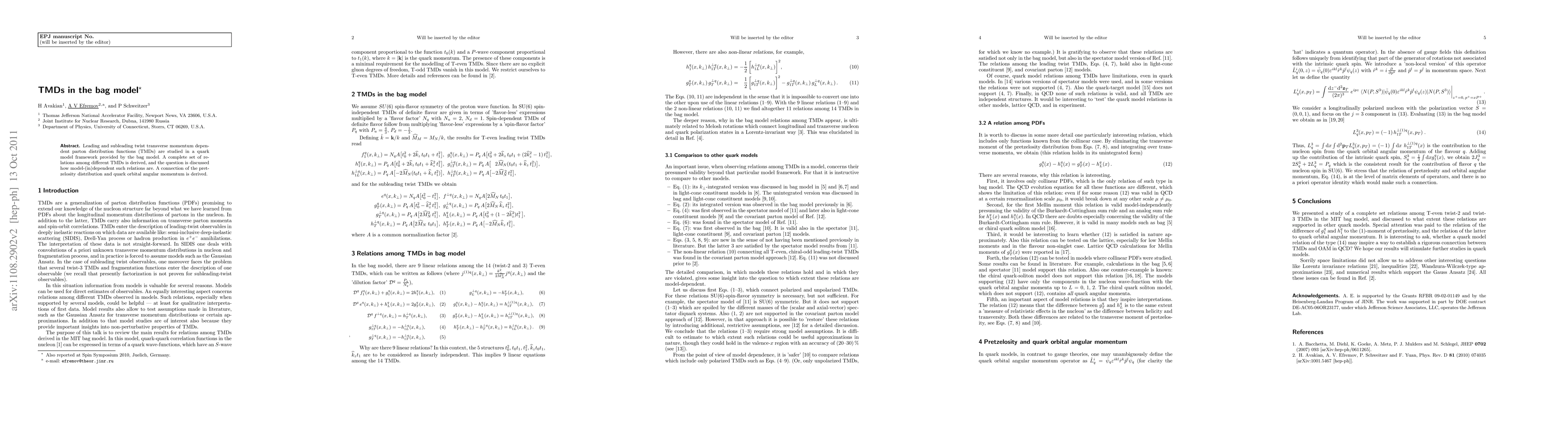 This paper investigates leading and subleading twist transverse momentum dependent parton distribution functions (TMDs) within the bag model framework, deriving a complete set of relations among different TMDs and exploring their model-dependence. It also establishes a connection between the pretzelosity distribution and quark orbital angular momentum.