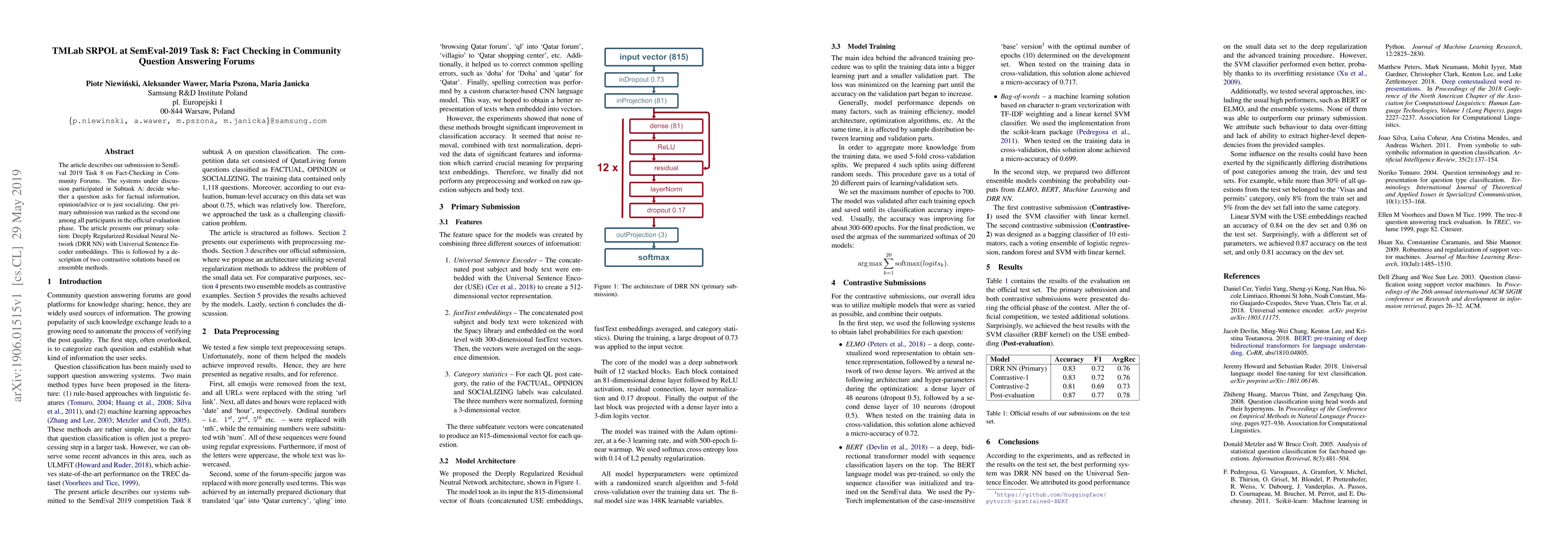 The paper details the TMLab SRPOL team's submission to SemEval 2019 Task 8 for fact-checking in community forums, focusing on classifying questions into factual, opinion/advice, or social categories. The team's primary solution, a Deeply Regularized Residual Neural Network (DRR NN) with Universal Sentence Encoder embeddings, ranked second in the official evaluation.