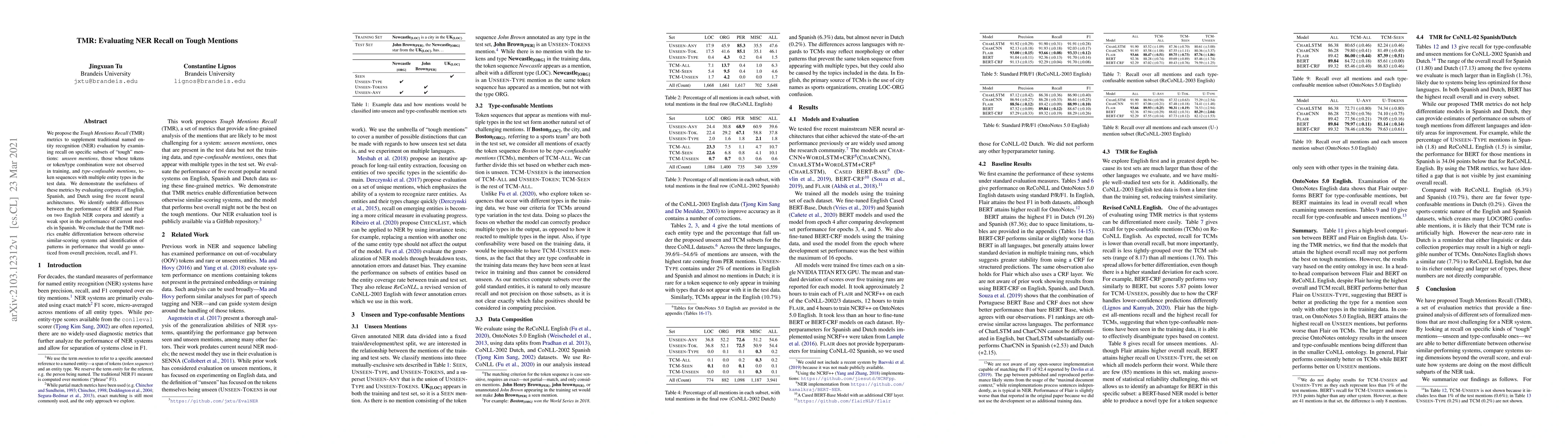 We propose the Tough Mentions Recall (TMR) metrics to supplement traditional named entity recognition (NER) evaluation by examining recall on specific subsets of "tough" mentions: unseen mentions, those whose tokens or token/type combination were not observed in training, and type-confusable mentions, token sequences with multiple entity types in the test data. We demonstrate the usefulness of these metrics by evaluating corpora of English, Spanish, and Dutch using five recent neural architectures. We identify subtle differences between the performance of BERT and Flair on two English NER corpora and identify a weak spot in the performance of current models in Spanish. We conclude that the TMR metrics enable differentiation between otherwise similar-scoring systems and identification of patterns in performance that would go unnoticed from overall precision, recall, and F1.