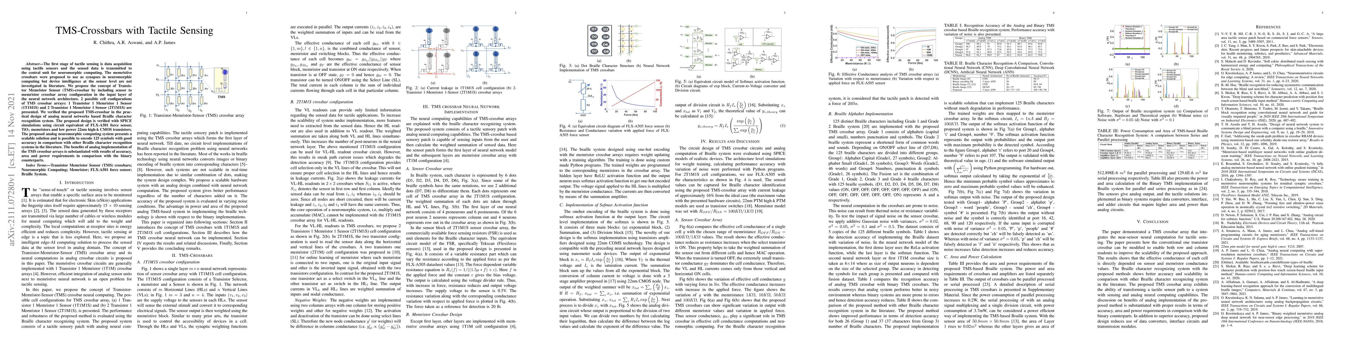 The research proposes TMS-crossbars integrating tactile sensing with near-sensor neural computation, modifying conventional transistor crossbars for dual row and column readouts to enhance scalability. The Braille character recognition system demonstrates improved accuracy and scalability compared to existing systems.