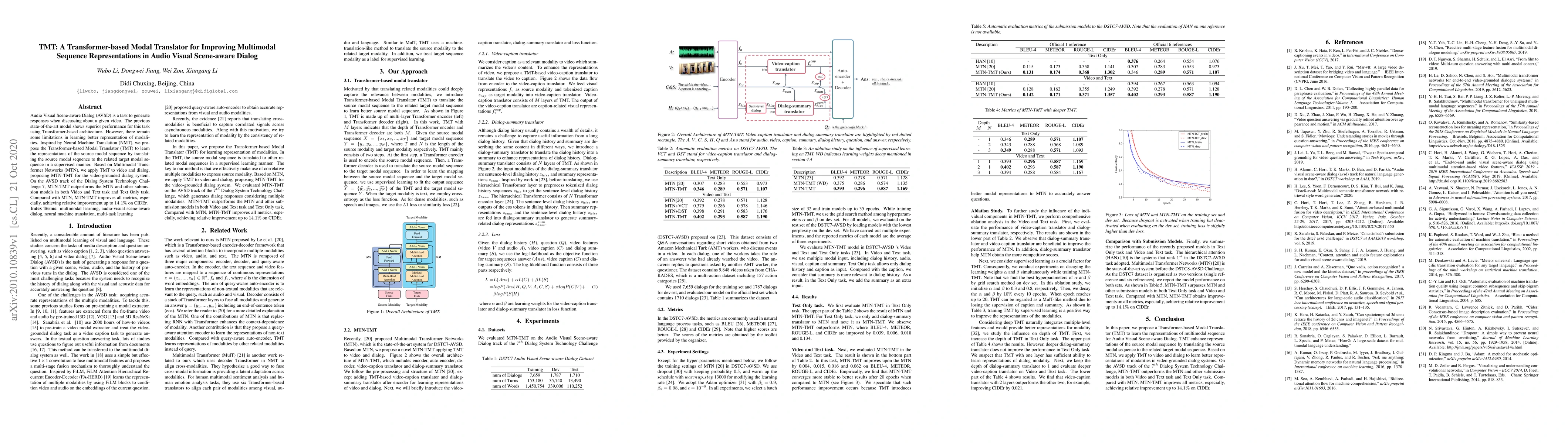 The paper proposes a Transformer-based Modal Translator (TMT) to enhance multimodal sequence representations in Audio Visual Scene-aware Dialog tasks, outperforming existing models by translating modality sequences in a supervised manner and achieving significant improvements in metric scores, particularly a 14.1% increase in CIDEr.