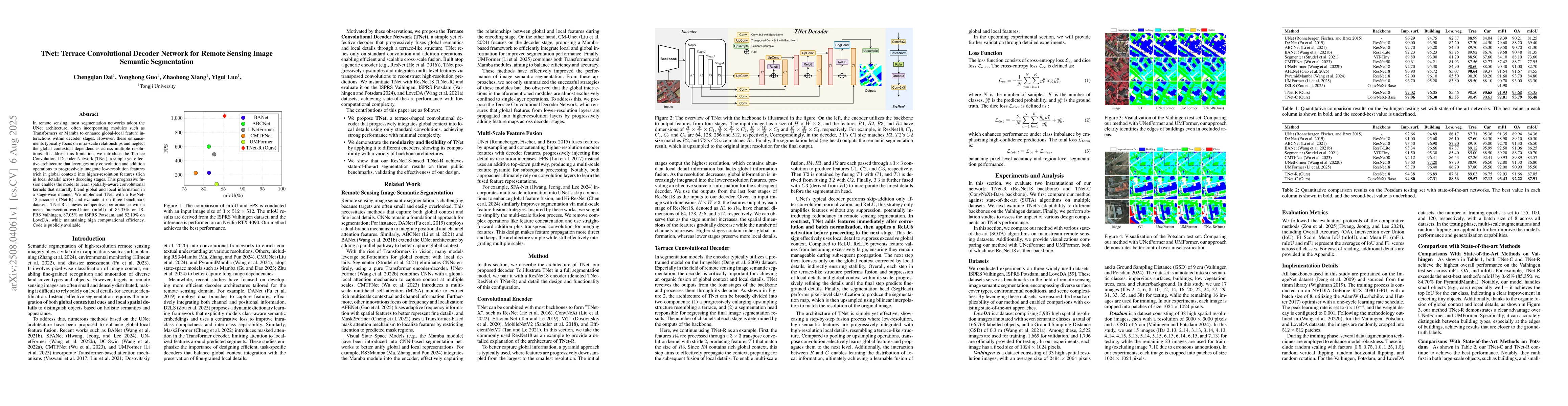 In remote sensing, most segmentation networks adopt the UNet architecture, often incorporating modules such as Transformers or Mamba to enhance global-local feature interactions within decoder stages. However, these enhancements typically focus on intra-scale relationships and neglect the global contextual dependencies across multiple resolutions. To address this limitation, we introduce the Terrace Convolutional Decoder Network (TNet), a simple yet effective architecture that leverages only convolution and addition operations to progressively integrate low-resolution features (rich in global context) into higher-resolution features (rich in local details) across decoding stages. This progressive fusion enables the model to learn spatially-aware convolutional kernels that naturally blend global and local information in a stage-wise manner. We implement TNet with a ResNet-18 encoder (TNet-R) and evaluate it on three benchmark datasets. TNet-R achieves competitive performance with a mean Intersection-over-Union (mIoU) of 85.35\% on ISPRS Vaihingen, 87.05\% on ISPRS Potsdam, and 52.19\% on LoveDA, while maintaining high computational efficiency. Code is publicly available.