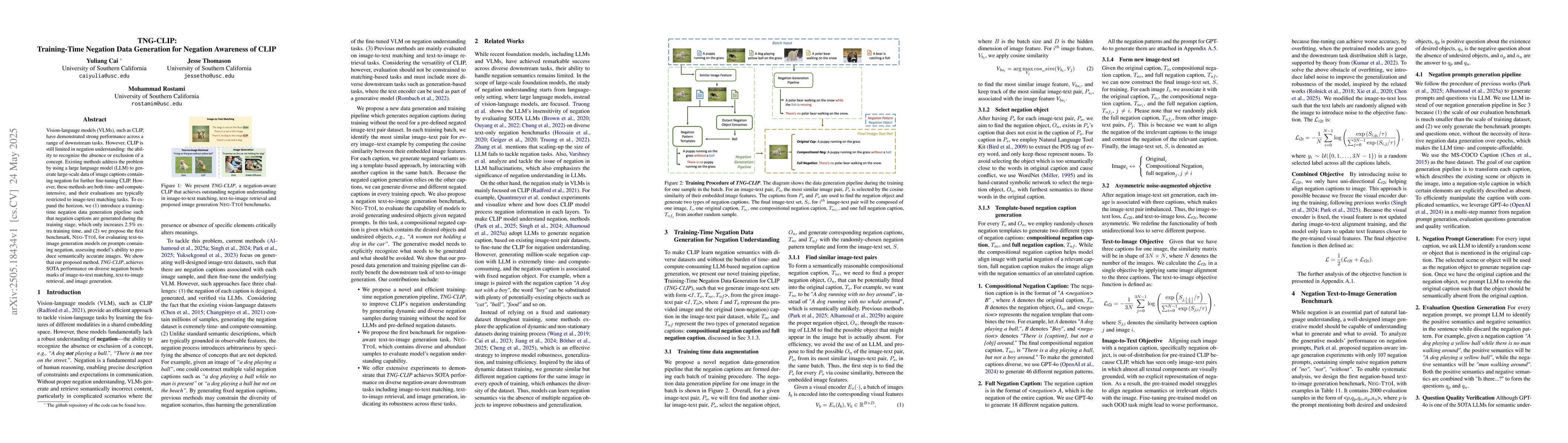 The paper introduces TNG-CLIP, a training-time negation data generation pipeline for improving negation understanding in vision-language models like CLIP. This method generates negation captions during training, adding only 2.5% extra time, and outperforms existing methods on diverse negation benchmarks for image-to-text matching, text-to-image retrieval, and image generation. The authors also present Neg-TtoI, a benchmark for evaluating text-to-image generation models on negation prompts.