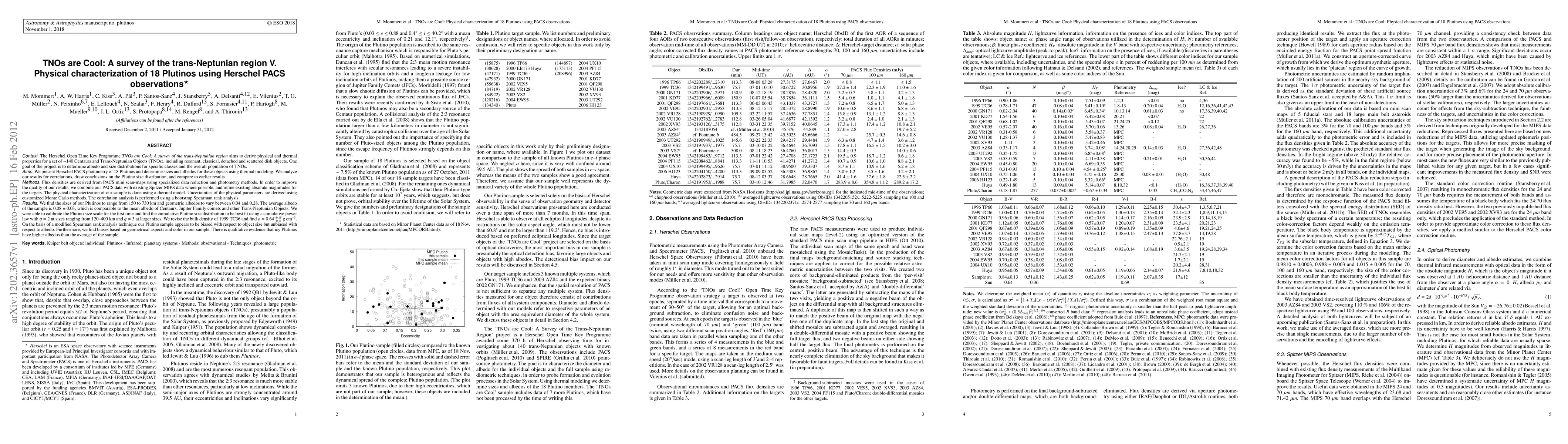This study uses Herschel PACS and Spitzer MIPS data to determine the sizes and albedos of 18 Plutinos, finding sizes ranging from 150 to 730 km and albedos between 0.04 and 0.28. The analysis reveals a Plutino size distribution best fit by a cumulative power law, and suggests biases in the sample based on size, geometry, and color.