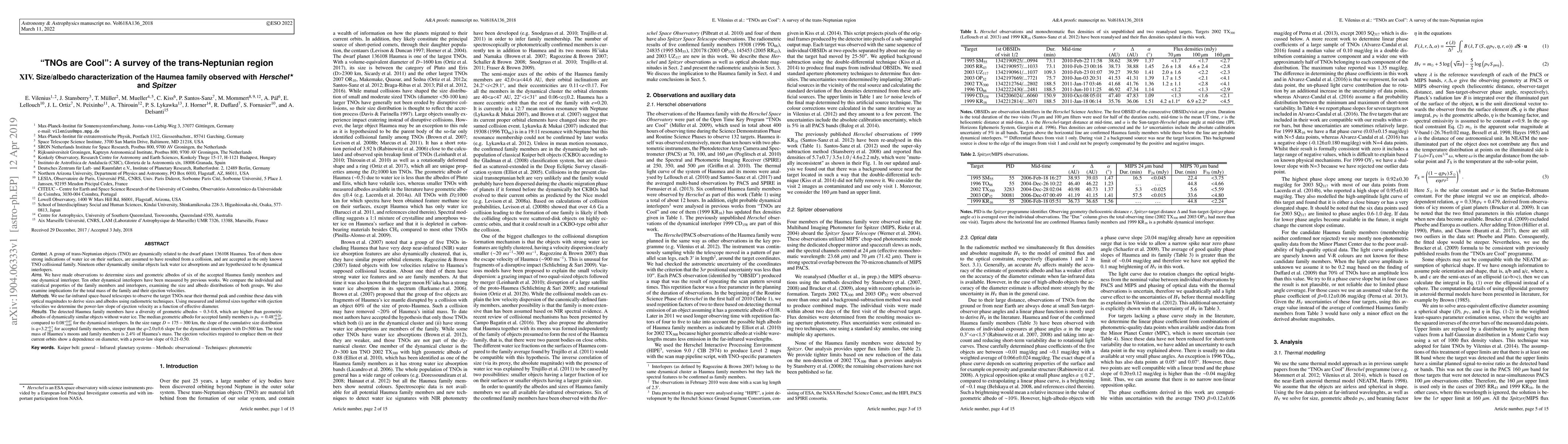 This paper investigates the sizes and geometric albedos of the Haumea family of trans-Neptunian objects (TNOs) using Herschel and Spitzer telescopes, finding that family members exhibit higher albedos and a steeper size distribution compared to dynamical interlopers. The study concludes that the family's total mass is 2.4% of Haumea's mass, with ejection velocities showing a diameter-dependent relationship.