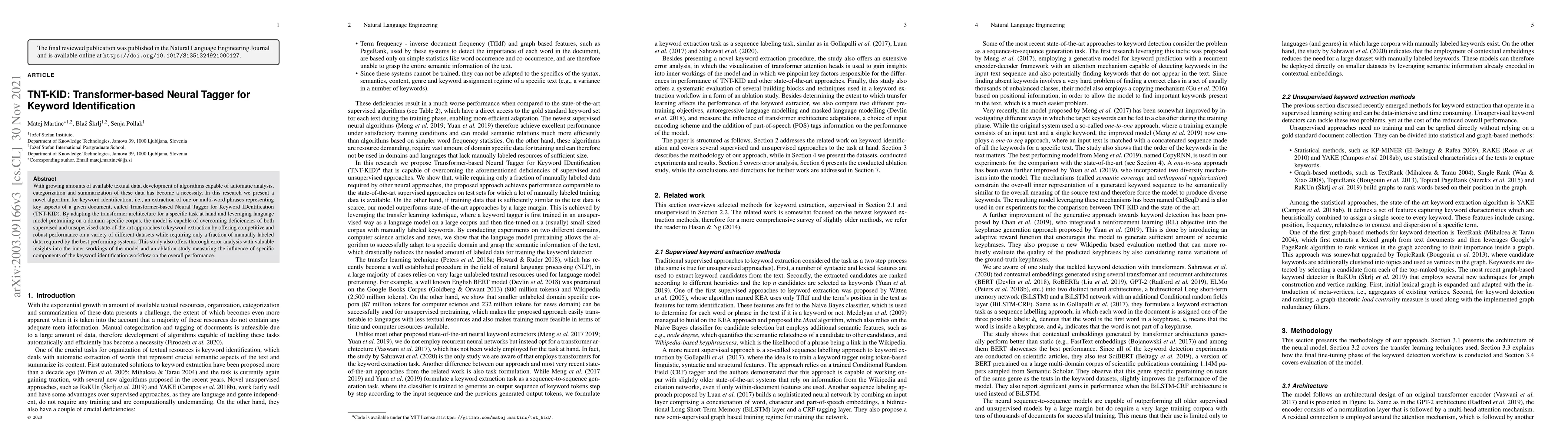 The paper introduces TNT-KID, a Transformer-based Neural Tagger for efficient keyword identification. It outperforms existing methods with less labeled data, utilizing pre-trained language models on domain-specific corpora. The study includes error analysis and an ablation study to understand model performance and component influence.
